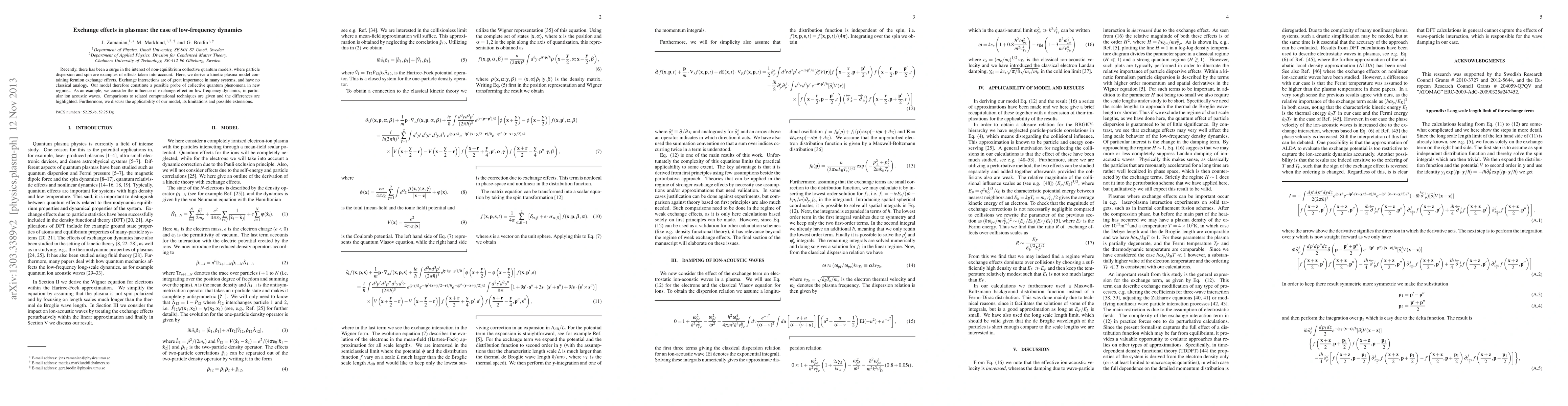 Recently, there has been a surge in the interest of non-equilibrium collective quantum models, where particle dispersion and spin are examples of effects taken into account. Here, we derive a kinetic plasma model con- taining fermion exchange effects. Exchange interactions are of great importance in many systems, and have no classical analogy. Our model therefore constitute a possible probe of collective quantum phenomena in new regimes. As an example, we consider the influence of exchange effect on low frequency dynamics, in partic- ular ion acoustic waves. Comparisons to related computational techniques are given and the differences are highlighted. Furthermore, we discuss the applicability of our model, its limitations and possible extensions.