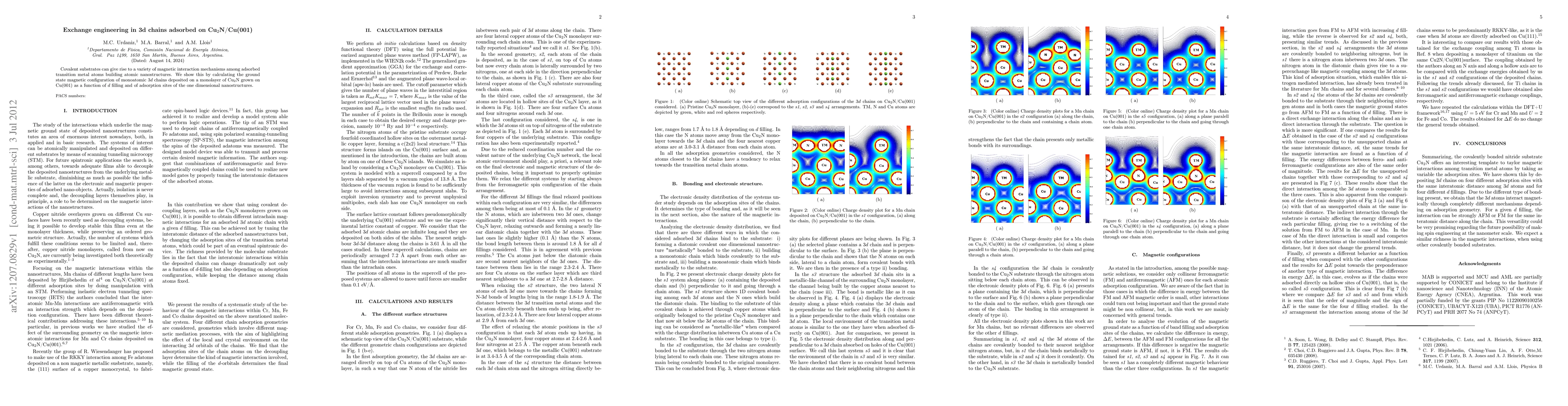 Covalent substrates can give rise to a variety of magnetic interaction mechanisms among adsorbed transition metal atoms building atomic nanostructures. We show this by calculating the ground state magnetic configuration of monoatomic 3d chains deposited on a monolayer of Cu$_2$N grown on Cu(001) as a function of $d$ filling and of adsorption sites of the one dimensional nanostructures.