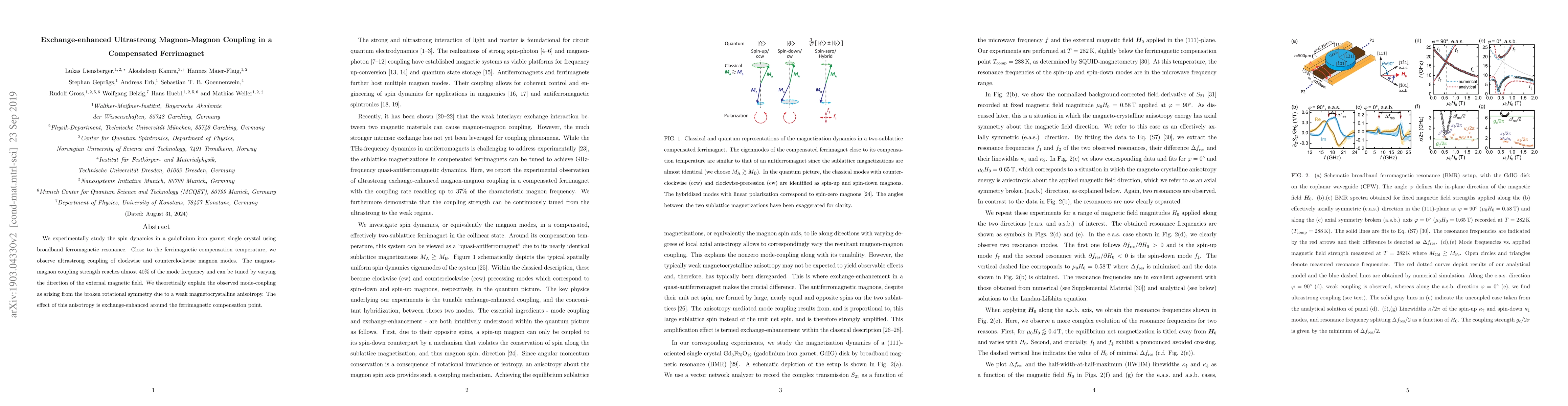 The ultrastrong coupling of (quasi-)particles has gained considerable attention due to its application potential and richness of the underlying physics. Coupling phenomena arising due to electromagnetic interactions are well explored. In magnetically ordered systems, the quantum-mechanical exchange-interaction should furthermore enable a fundamentally different coupling mechanism. Here, we report the observation of ultrastrong intralayer exchange-enhanced magnon-magnon coupling in a compensated ferrimagnet. We experimentally study the spin dynamics in a gadolinium iron garnet single crystal using broadband ferromagnetic resonance. Close to the ferrimagnetic compensation temperature, we observe ultrastrong coupling of clockwise and anticlockwise magnon modes. The magnon-magnon coupling strength reaches more than 30% of the mode frequency and can be tuned by varying the direction of the external magnetic field. We theoretically explain the observed phenomenon in terms of an exchange-enhanced mode-coupling mediated by a weak cubic anisotropy.
