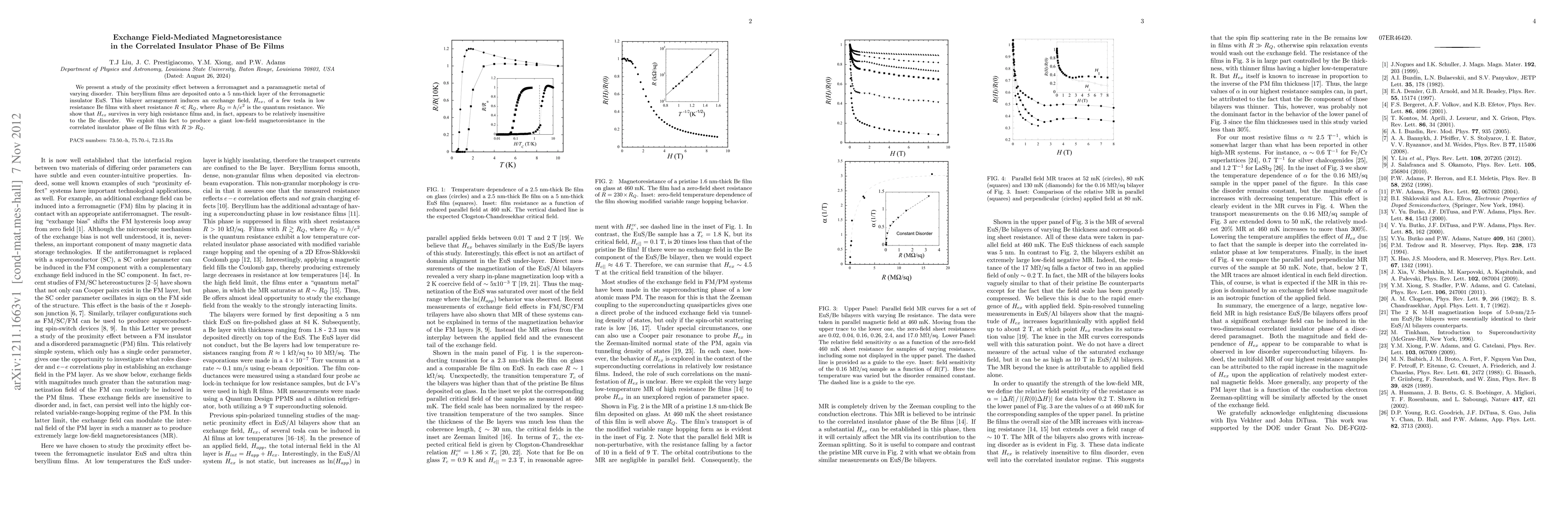We present a study of the proximity effect between a ferromagnet and a paramagnetic metal of varying disorder. Thin beryllium films are deposited onto a 5 nm-thick layer of the ferromagnetic insulator EuS. This bilayer arrangement induces an exchange field, $H_{ex}$, of a few tesla in low resistance Be films with sheet resistance $R\ll R_Q$, where $R_Q=h/e^2$ is the quantum resistance. We show that $H_{ex}$ survives in very high resistance films and, in fact, appears to be relatively insensitive to the Be disorder. We exploit this fact to produce a giant low-field magnetoresistance in the correlated insulator phase of Be films with $R\gg R_Q$.