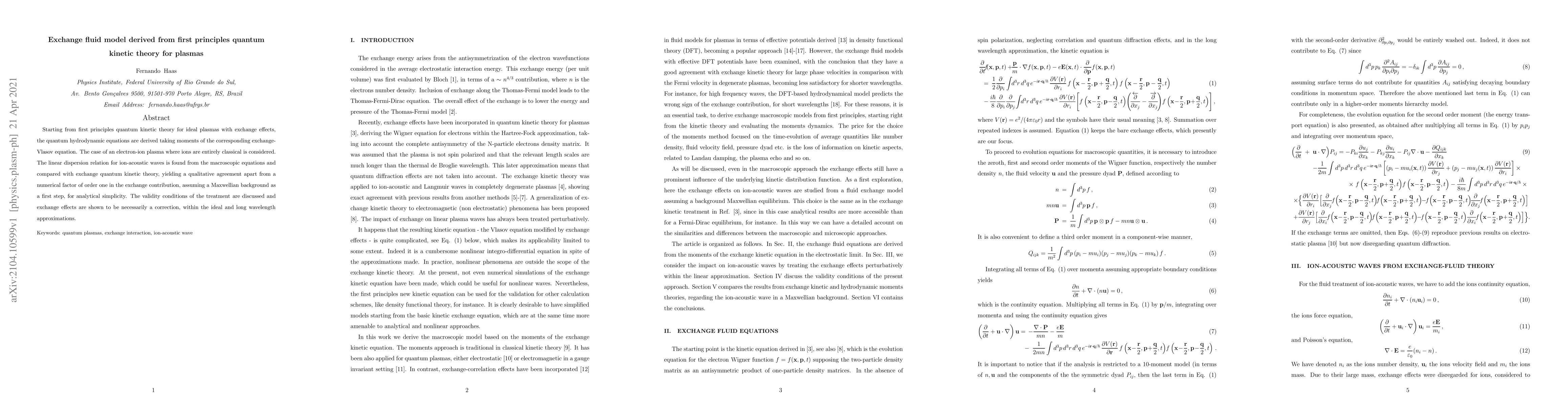 Starting from first principles quantum kinetic theory for ideal plasmas with exchange effects, the quantum hydrodynamic equations are derived taking moments of the corresponding exchange-Vlasov equation. The case of an electron-ion plasma where ions are entirely classical is considered. The linear dispersion relation for ion-acoustic waves is found from the macroscopic equations and compared with exchange quantum kinetic theory, yielding a qualitative agreement apart from a numerical factor of order one in the exchange contribution, assuming a Maxwellian background as a first step, for analytical simplicity. The validity conditions of the treatment are discussed and exchange effects are shown to be necessarily a correction, within the ideal and long wavelength approximations.