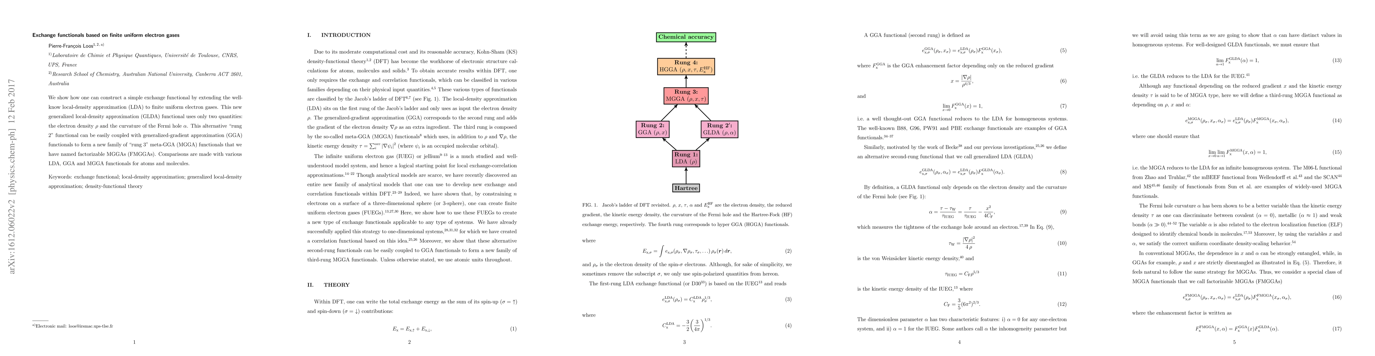 We show how one can construct \alert{a simple} exchange functional by extending the well-know local-density approximation (LDA) to finite uniform electron gases. This new generalized local-density approximation (GLDA) functional uses only two quantities: the electron density $\rho$ and the curvature of the Fermi hole $\alpha$. This alternative "rung 2" functional can be easily coupled with generalized-gradient approximation (GGA) functionals to form a new family of "rung 3" meta-GGA (MGGA) functionals that we have named factorizable MGGAs (FMGGAs). Comparisons are made with various LDA, GGA and MGGA functionals for atoms and molecules.
