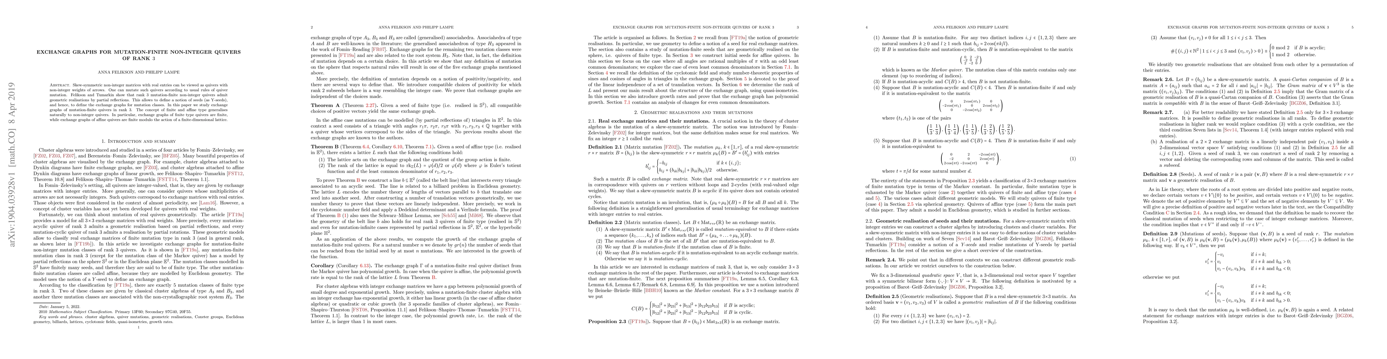 This paper investigates exchange graphs for mutation-finite non-integer quivers of rank 3, showing that these can be realized geometrically via partial reflections. It establishes that finite type quivers yield finite exchange graphs, while affine type quivers produce finite exchange graphs modulo the action of a finite-dimensional lattice.