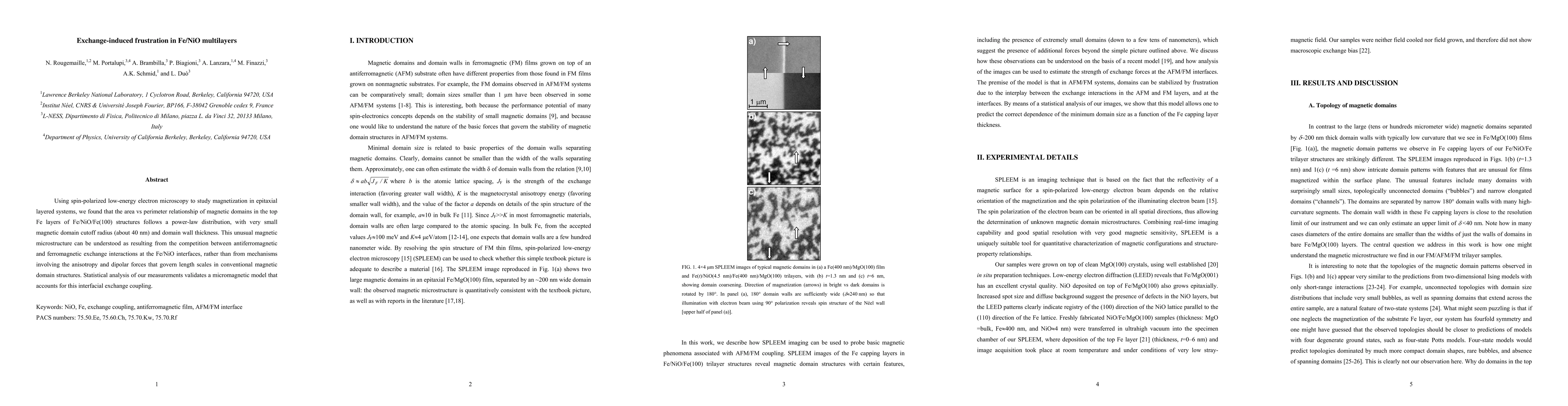 Using spin-polarized low-energy electron microscopy to study magnetization in epitaxial layered systems, we found that the area vs perimeter relationship of magnetic domains in the top Fe layers of Fe/NiO/Fe(100) structures follows a power-law distribution, with very small magnetic domain cutoff radius (about 40 nm) and domain wall thickness. This unusual magnetic microstructure can be understood as resulting from the competition between antiferromagnetic and ferromagnetic exchange interactions at the Fe/NiO interfaces, rather than from mechanisms involving the anisotropy and dipolar forces that govern length scales in conventional magnetic domain structures. Statistical analysis of our measurements validates a micromagnetic model that accounts for this interfacial exchange coupling.