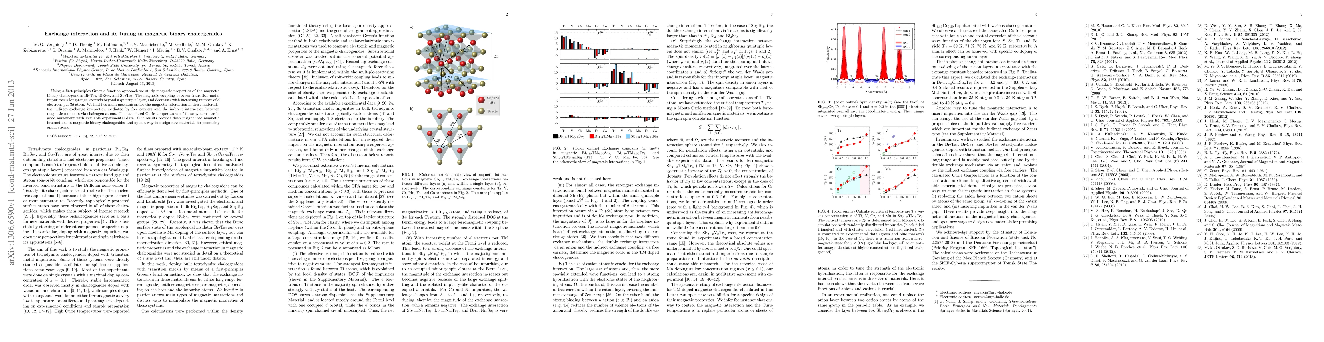 Using a first-principles Green's function approach we study magnetic properties of the magnetic binary chalcogenides Bi2Te3, Bi2Se3, and Sb2Te3. The magnetic coupling between transition-metal impurities is long-range, extends beyond a quintuple layer, and decreases with increasing number of d electrons per 3d atom. We find two main mechanisms for the magnetic interaction in these materials: the indirect exchange interaction mediated by free carriers and the indirect interaction between magnetic moments via chalcogen atoms. The calculated Curie temperatures of these systems are in good agreement with available experimental data. Our results provide deep insight into magnetic interactions in magnetic binary chalcogenides and open a way to design new materials for promising applications.