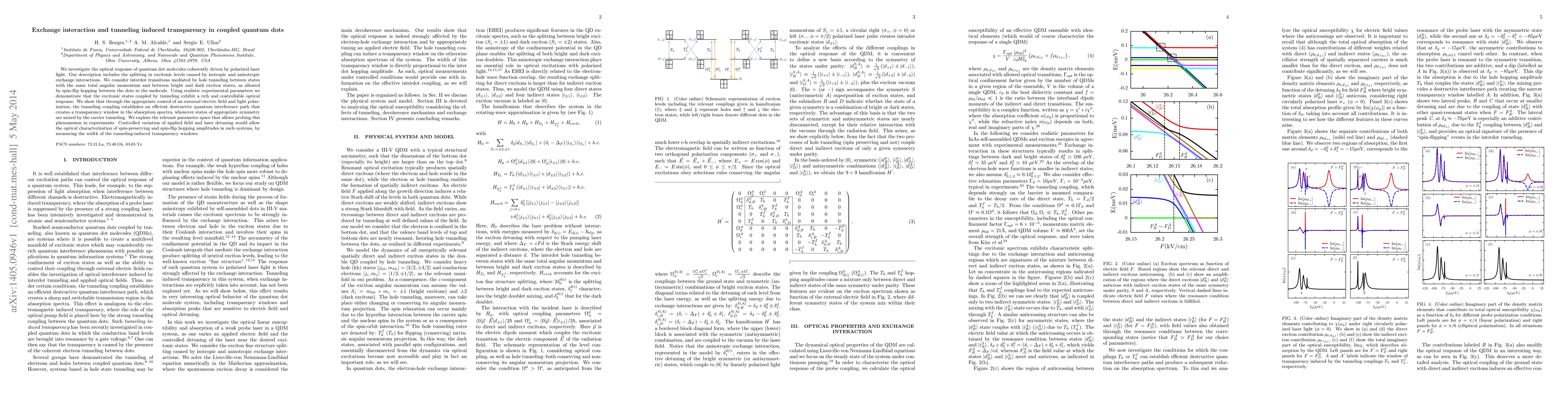This paper explores the optical response of coupled quantum dot molecules driven by polarized laser light, focusing on the effects of exchange interactions and tunneling on excitonic levels. It demonstrates that tunneling coupling can create a transparency window in absorption spectra through controlled destructive interference, enabling the optical characterization of spin-preserving and spin-flip hopping amplitudes.