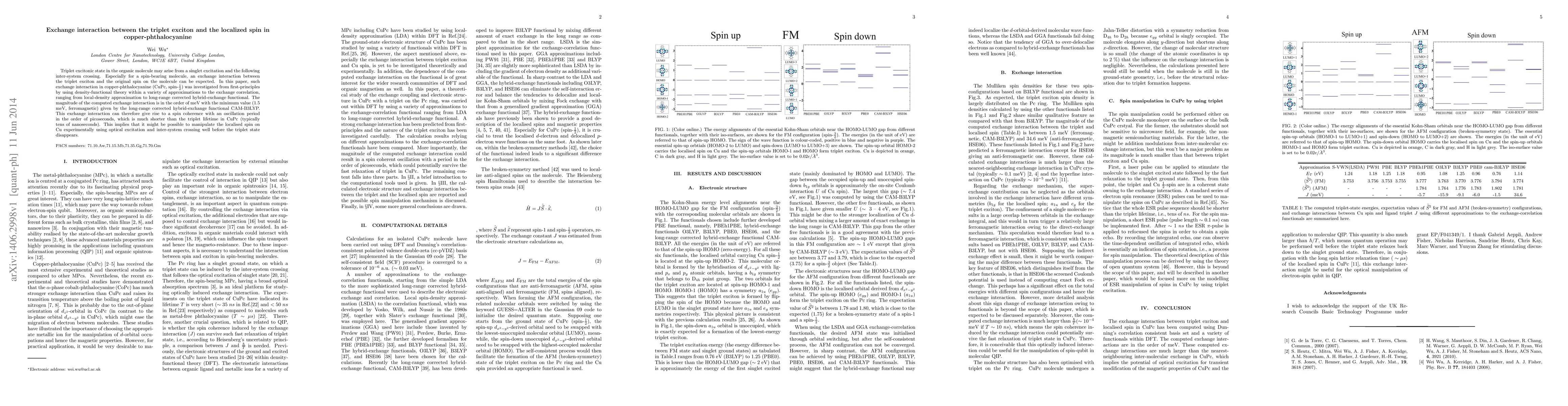 This paper investigates the exchange interaction between the triplet exciton and the localized spin in copper-phthalocyanine using density-functional theory. The computed exchange interaction magnitude is in the order of meV, suggesting potential for manipulating the localized spin experimentally via optical excitation.