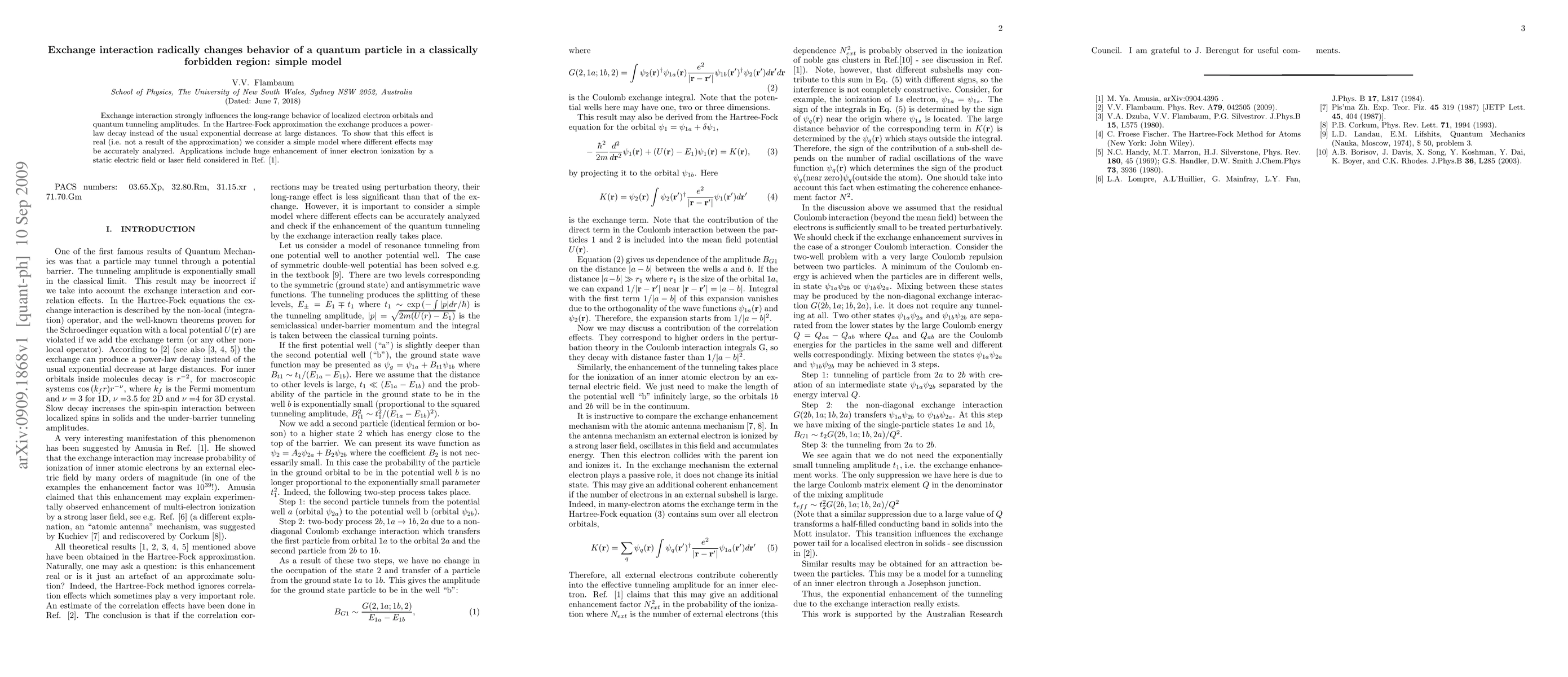Exchange interaction strongly influences the long-range behavior of localized electron orbitals and quantum tunneling amplitudes.In the Hartree-Fock approximation the exchange produces a power-law decay instead of the usual exponential decrease at large distances. To show that this effect is real (i.e. not a result of the approximation) we consider a simple model where different effects may be accurately analyzed. Applications include huge enhancement of inner electron ionization by a static electric field or laser field considered in Ref. M. Ya. Amusia, arxiv:0904.4395