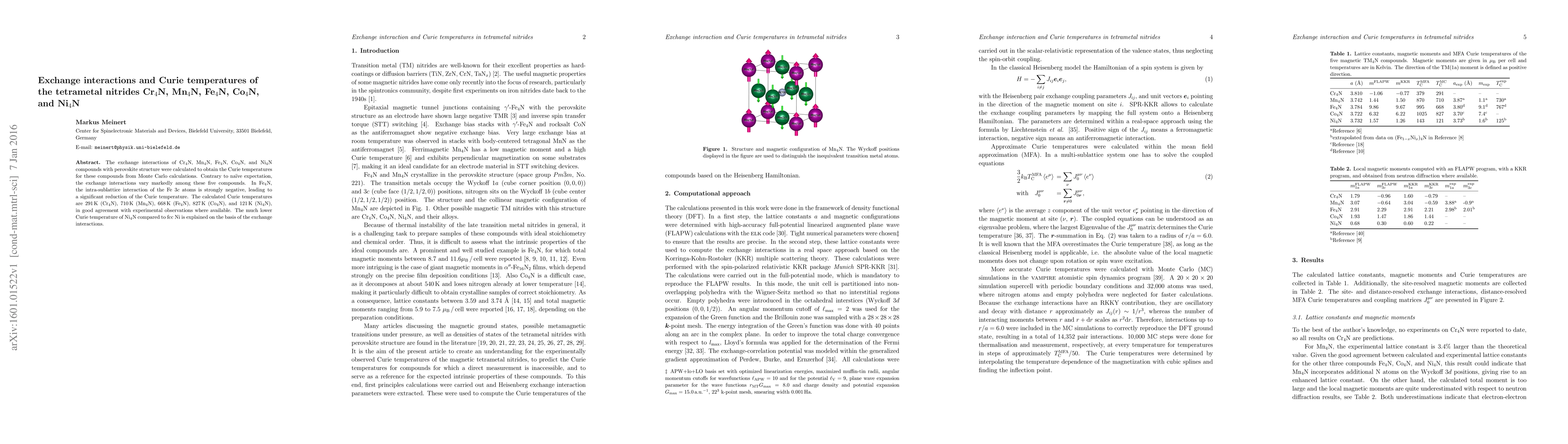 This study calculates the exchange interactions and Curie temperatures of perovskite tetrametal nitrides Cr4N, Mn4N, Fe4N, Co4N, and Ni4N using Monte Carlo simulations. Contrary to expectations, Fe4N shows a strongly negative intra-sublattice interaction, significantly lowering its Curie temperature to 668K, while Mn4N has the highest at 827K.