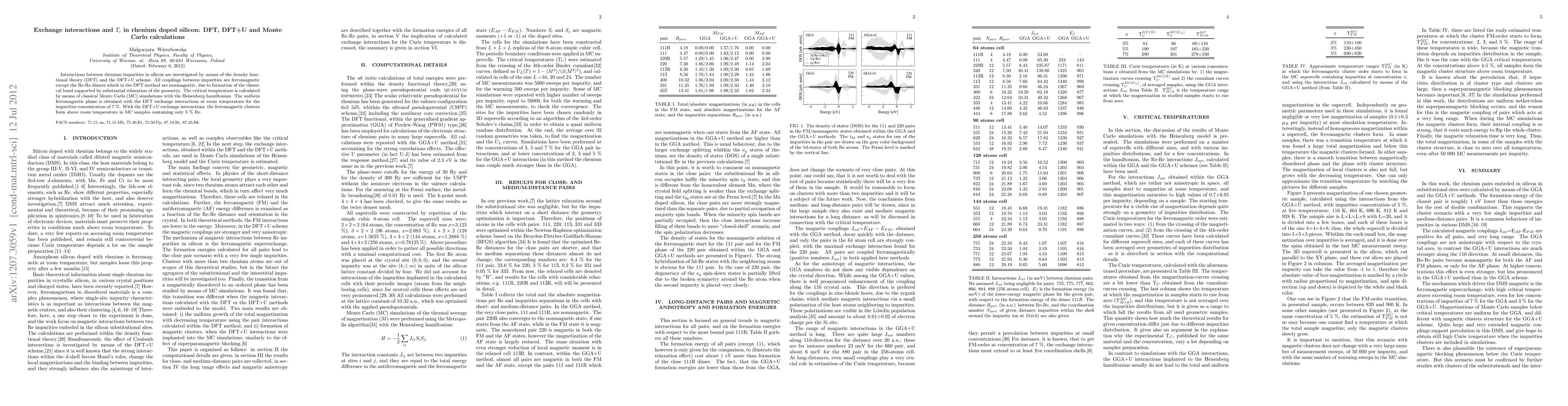 Researchers investigated the effects of rhenium impurities in silicon using DFT and Monte Carlo calculations, finding that ferromagnetic interactions occur at room temperature with high concentrations of Re, but above room temperature with lower concentrations.