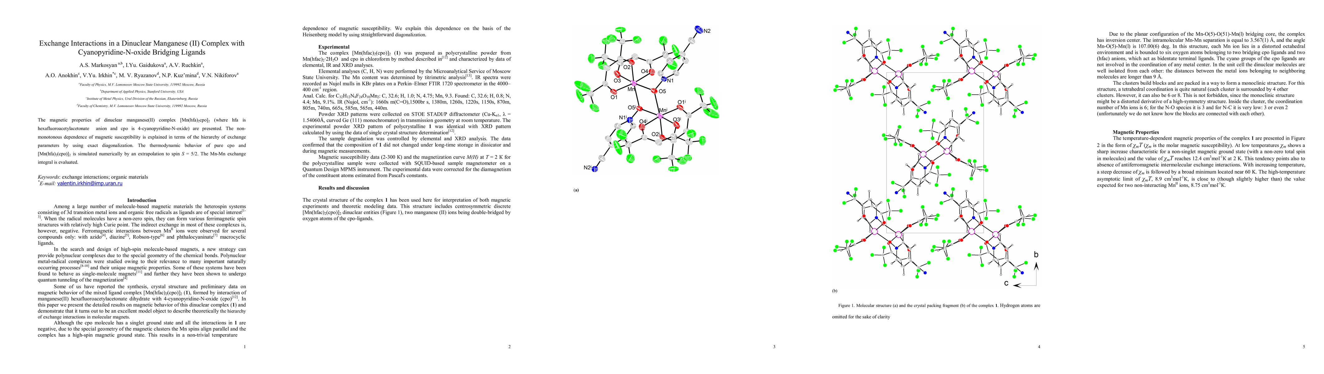 Researchers studied a manganese complex with bridging cyanopyridine-N-oxide ligands, finding non-monotonic magnetic behavior explained by exchange parameters, and evaluated the Mn-Mn exchange integral.