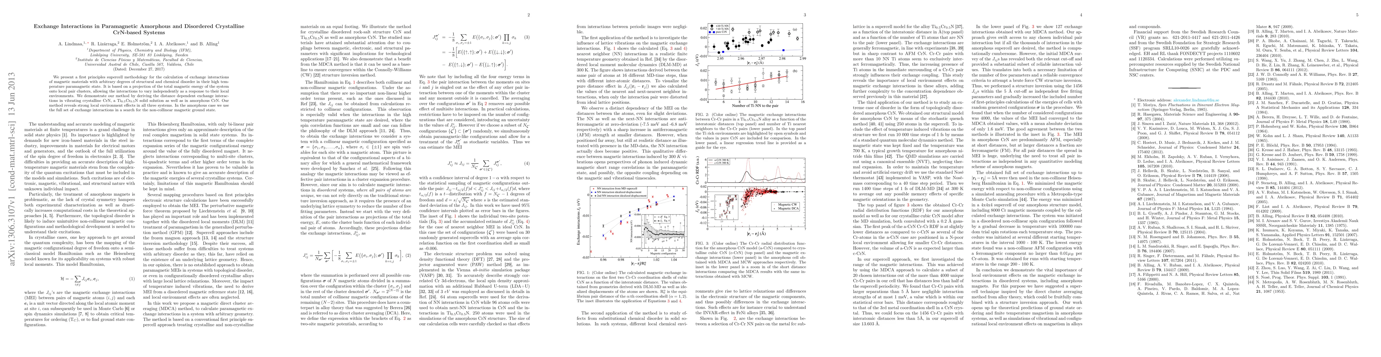 This paper introduces a first principles supercell method to calculate exchange interactions in paramagnetic CrN-based systems with structural and chemical disorder. The study reveals significant local environment effects in crystalline CrN, Ti$_{0.5}$Cr$_{0.5}$N, and amorphous CrN, and identifies non-collinear magnetic ground states in the amorphous phase.
