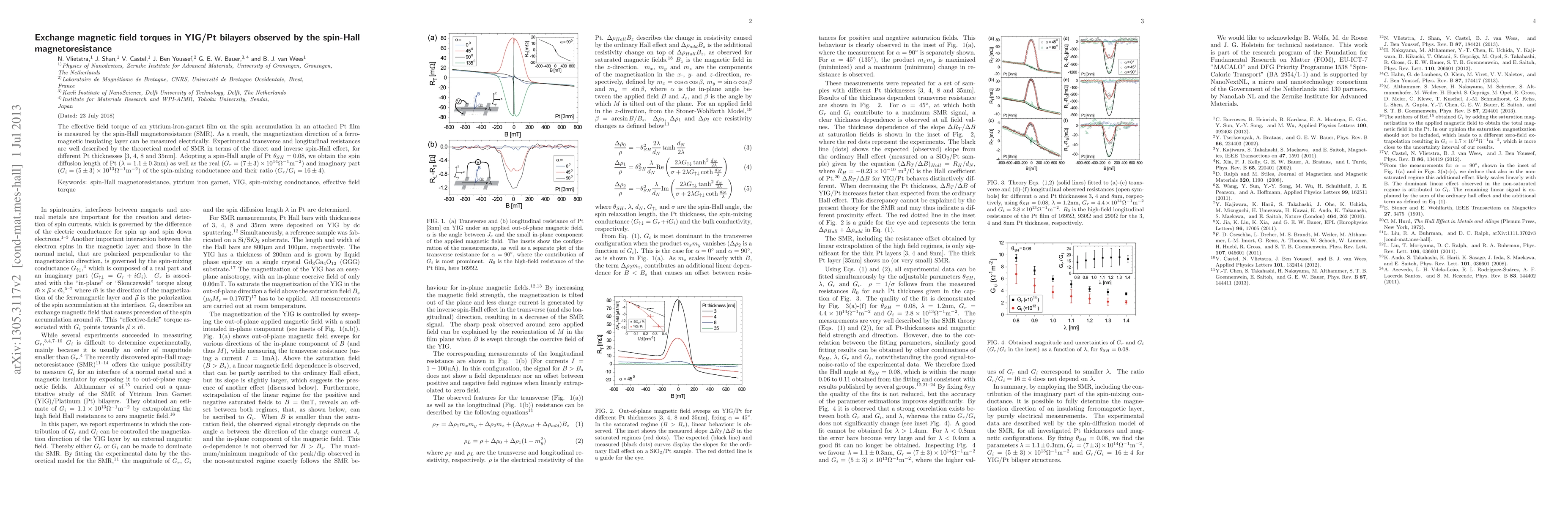The effective field torque of an yttrium-iron-garnet film on the spin accumulation in an attached Pt film is measured by the spin-Hall magnetoresistance (SMR). As a result, the magnetization direction of a ferromagnetic insulating layer can be measured electrically. Experimental transverse and longitudinal resistances are well described by the theoretical model of SMR in terms of the direct and inverse spin-Hall effect, for different Pt thicknesses [3, 4, 8 and 35nm]. Adopting a spin-Hall angle of Pt $\theta_{SH}=0.08$, we obtain the spin diffusion length of Pt ($\lambda=1.1\pm0.3$nm) as well as the real ($G_r=(7\pm3)\times10^{14}\Omega^{-1}$m$^{-2}$) and imaginary part ($G_i=(5\pm3)\times10^{13}\Omega^{-1}$m$^{-2}$) of the spin-mixing conductance and their ratio ($G_r/G_i=16\pm4$).