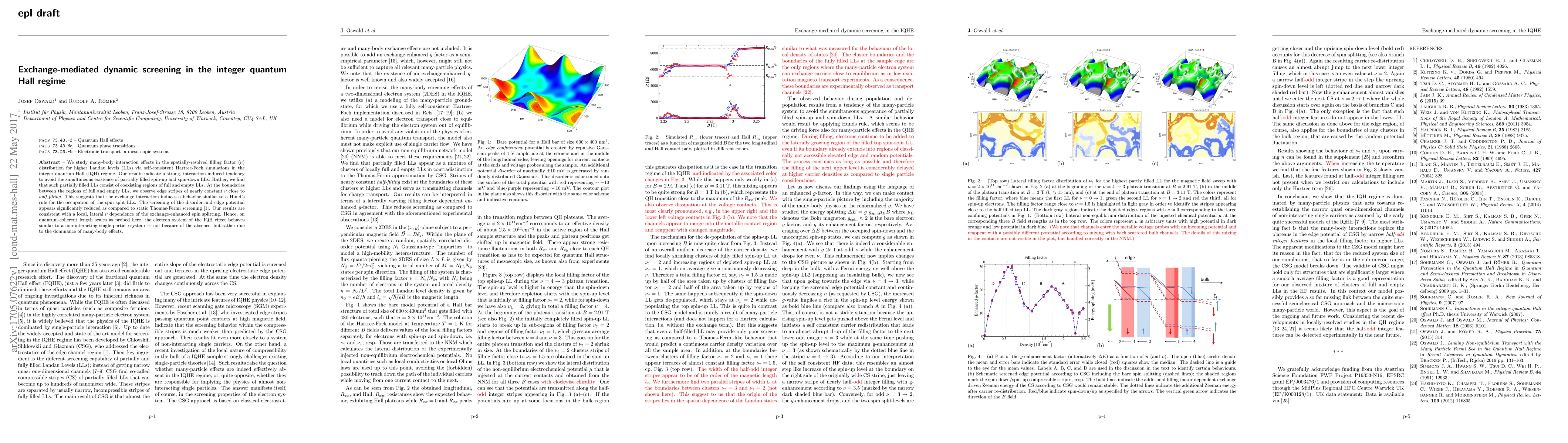This paper investigates many-body interactions in the integer quantum Hall regime, revealing that exchange-mediated screening leads to regions of full and empty Landau levels, with edge stripes near half-filling. The findings suggest that exchange interactions induce a behavior akin to Hund's rule for spin-split levels, and significantly reduce disorder screening compared to static models.