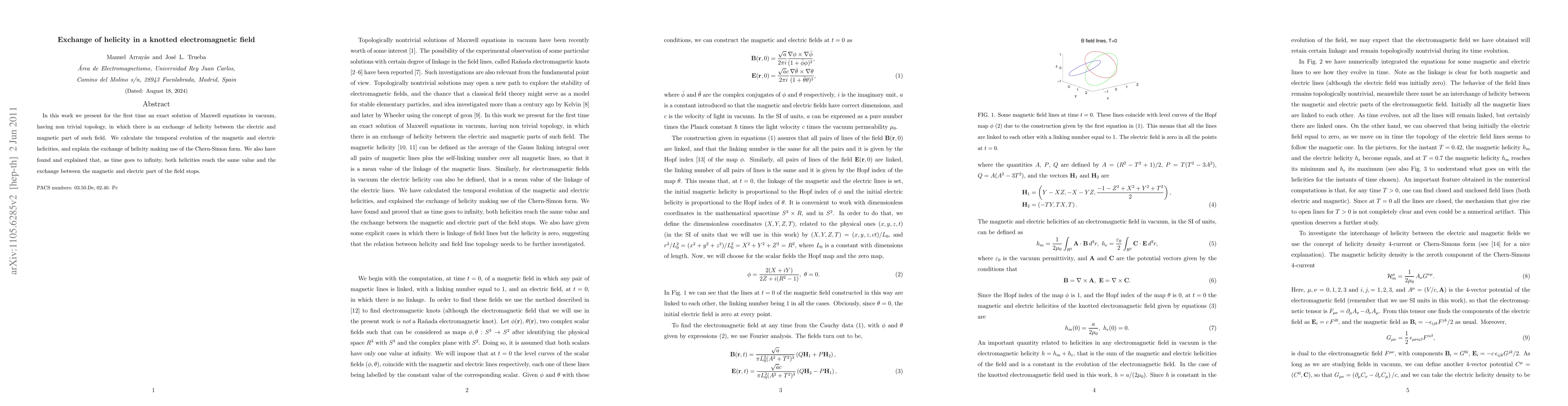 This paper presents an exact solution of Maxwell's equations in vacuum with non-trivial topology, demonstrating an exchange of helicity between the electric and magnetic fields. The study uses the Chern-Simon form to explain this phenomenon and shows that both helicities converge to the same value as time approaches infinity.