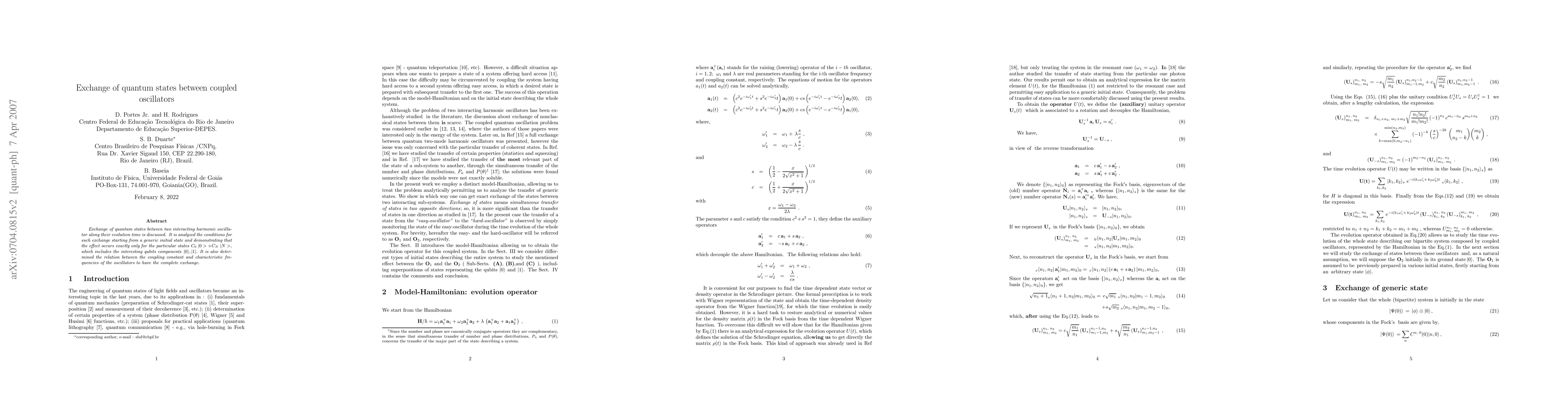 The paper investigates the quantum state exchange between two coupled harmonic oscillators, finding that such exchange occurs precisely for specific initial states, notably those involving qubit components |0> and |1>, and relates the degree of exchange to the coupling constant and oscillator frequencies.