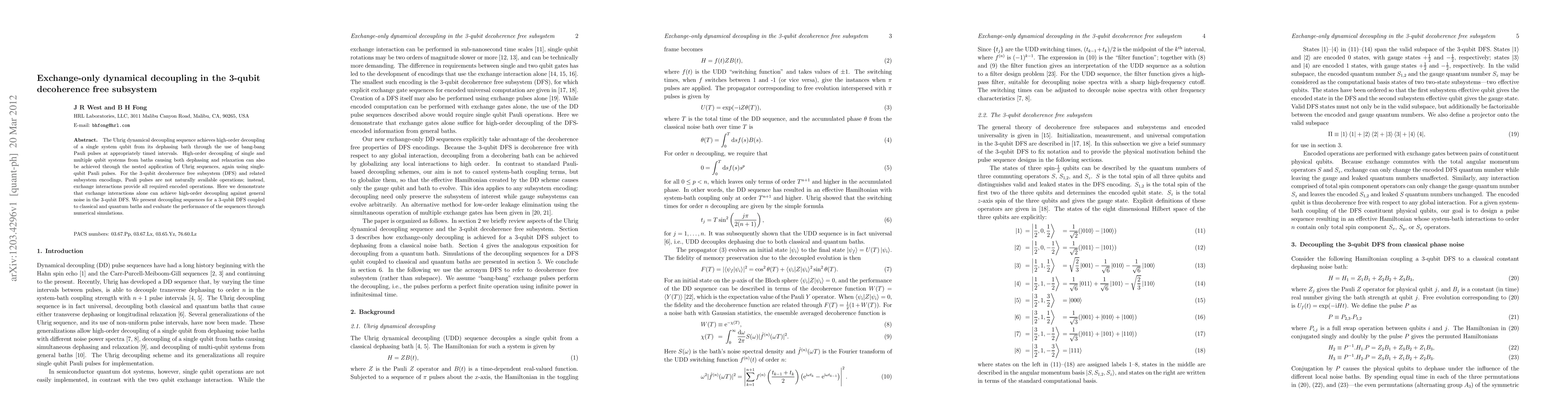 This paper demonstrates that high-order dynamical decoupling in a 3-qubit decoherence free subsystem (DFS) can be achieved solely using exchange interactions, without the need for Pauli pulses. Numerical simulations show effective decoupling from both classical and quantum noise environments.