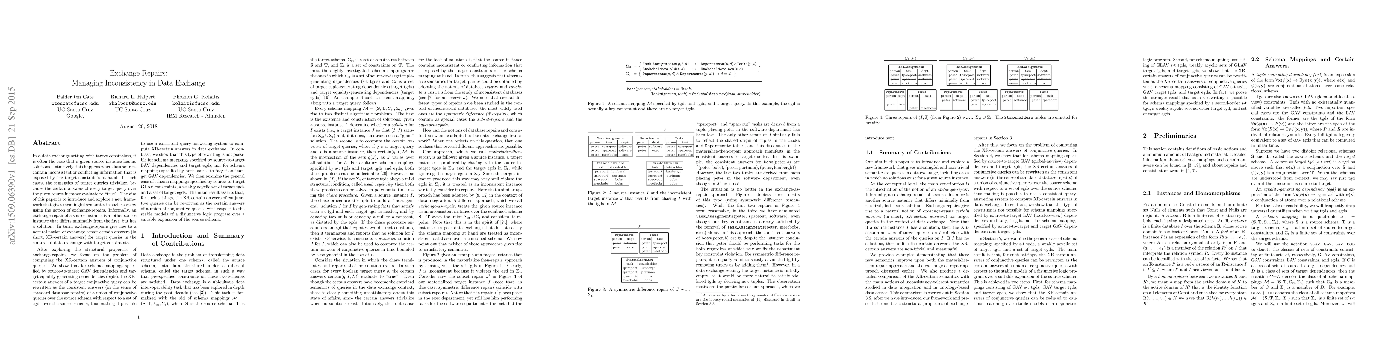 This paper introduces a framework for managing inconsistency in data exchange by using exchange-repairs, which are minimal modifications to source instances that yield solutions. It shows how exchange-repair certain answers can be computed using consistent query-answering systems and stable models for complex schema mappings.