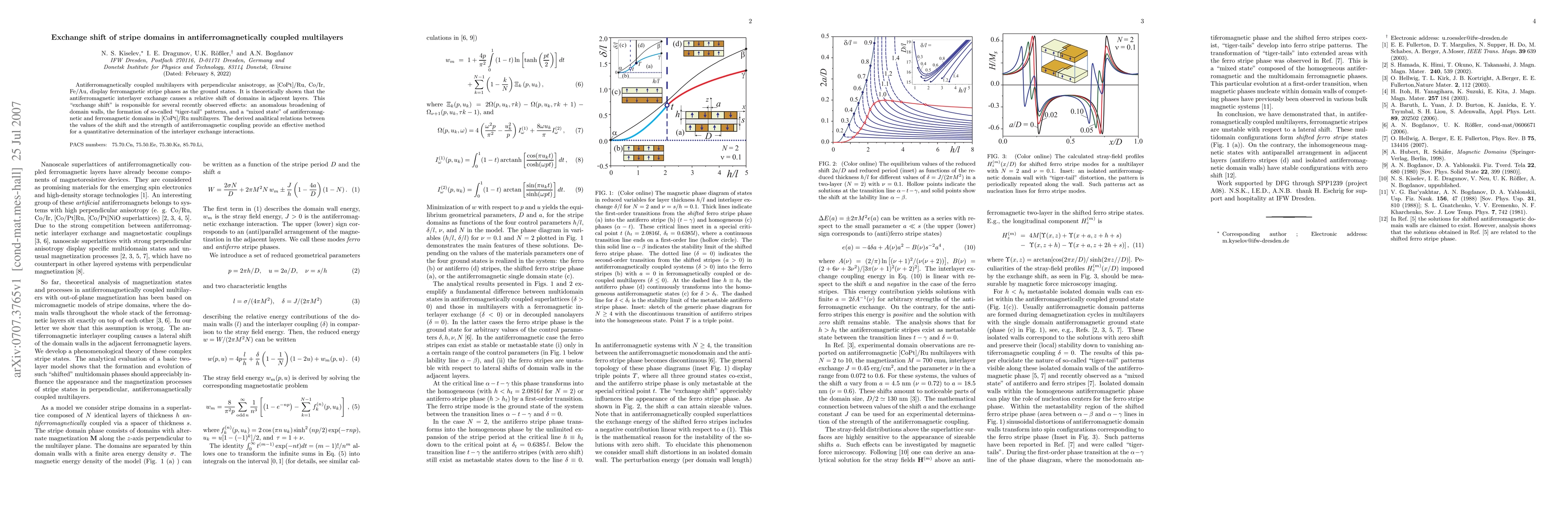 This paper theoretically demonstrates that antiferromagnetic coupling in multilayers with perpendicular anisotropy induces an "exchange shift" of ferromagnetic stripe domains, explaining phenomena like anomalous domain wall broadening and "tiger-tail" patterns. Analytical relations derived from the theory offer a quantitative method for determining interlayer exchange interactions.