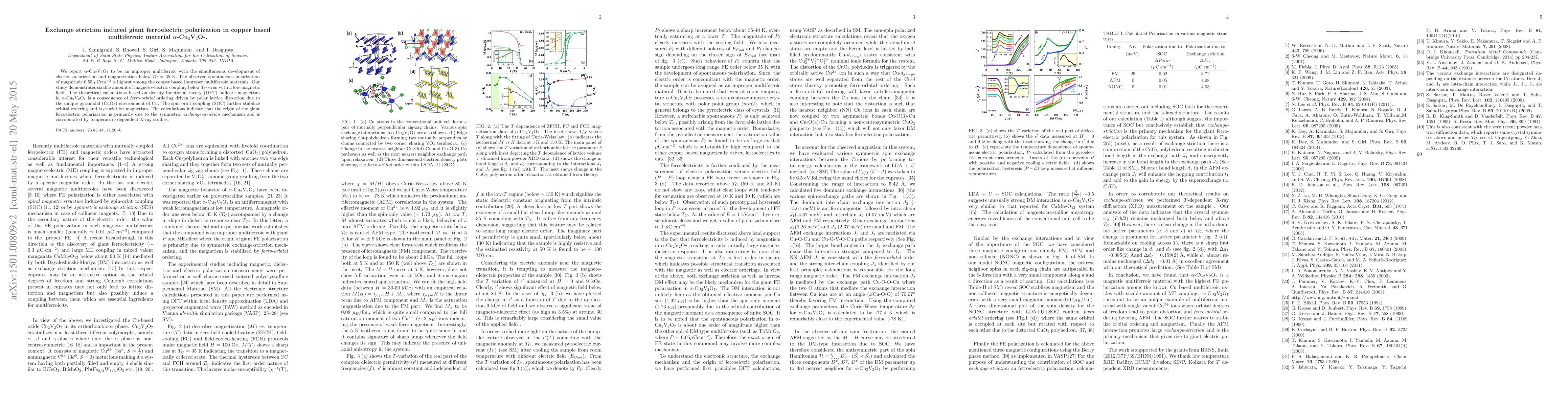 This paper reports $\alpha$-Cu$_2$V$_2$O$_7$ as an improper multiferroic material exhibiting significant spontaneous polarization and magnetization below its Curie temperature of 35 K. The study reveals that the giant ferroelectric polarization is primarily due to the symmetric exchange-striction mechanism, supported by density functional theory calculations and temperature-dependent X-ray studies.