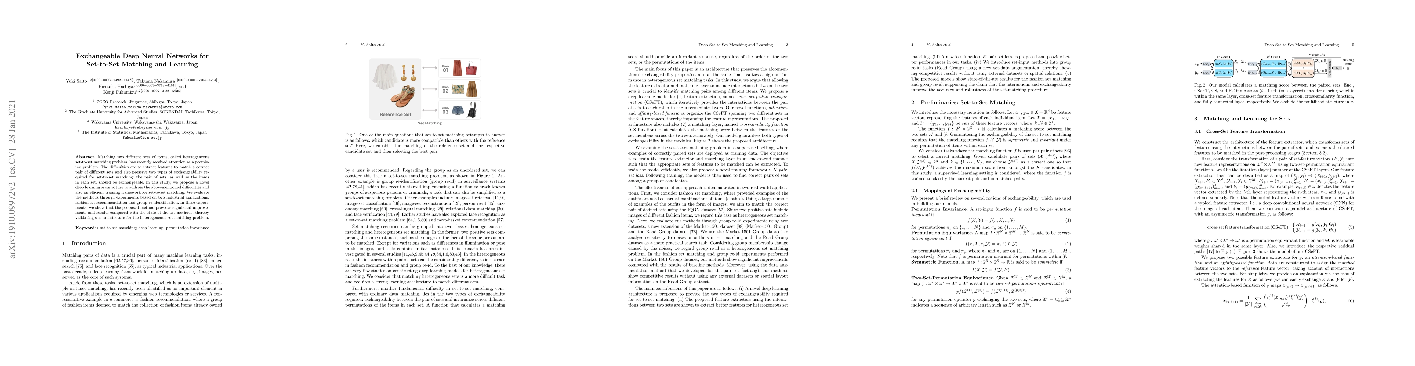 Matching two different sets of items, called heterogeneous set-to-set matching problem, has recently received attention as a promising problem. The difficulties are to extract features to match a correct pair of different sets and also preserve two types of exchangeability required for set-to-set matching: the pair of sets, as well as the items in each set, should be exchangeable. In this study, we propose a novel deep learning architecture to address the abovementioned difficulties and also an efficient training framework for set-to-set matching. We evaluate the methods through experiments based on two industrial applications: fashion set recommendation and group re-identification. In these experiments, we show that the proposed method provides significant improvements and results compared with the state-of-the-art methods, thereby validating our architecture for the heterogeneous set matching problem.
