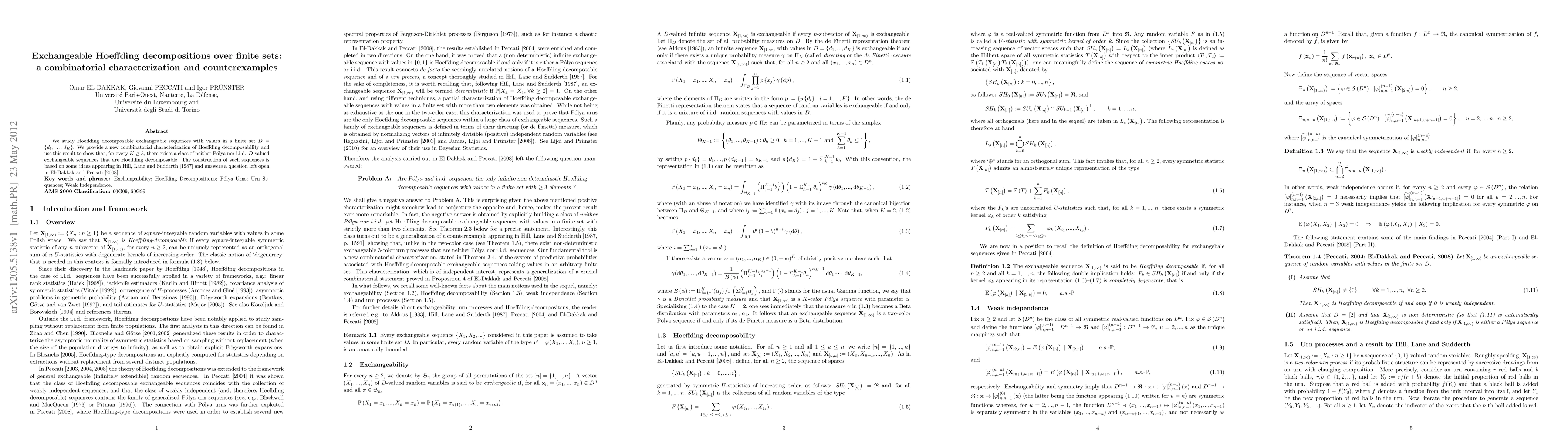 This paper characterizes Hoeffding decomposable exchangeable sequences over finite sets and demonstrates that when the set size exceeds 2, there exist non-Pólya and non-i.i.d. sequences that are Hoeffding decomposable, using ideas from Hill, Lane, and Sudderth [1987].
