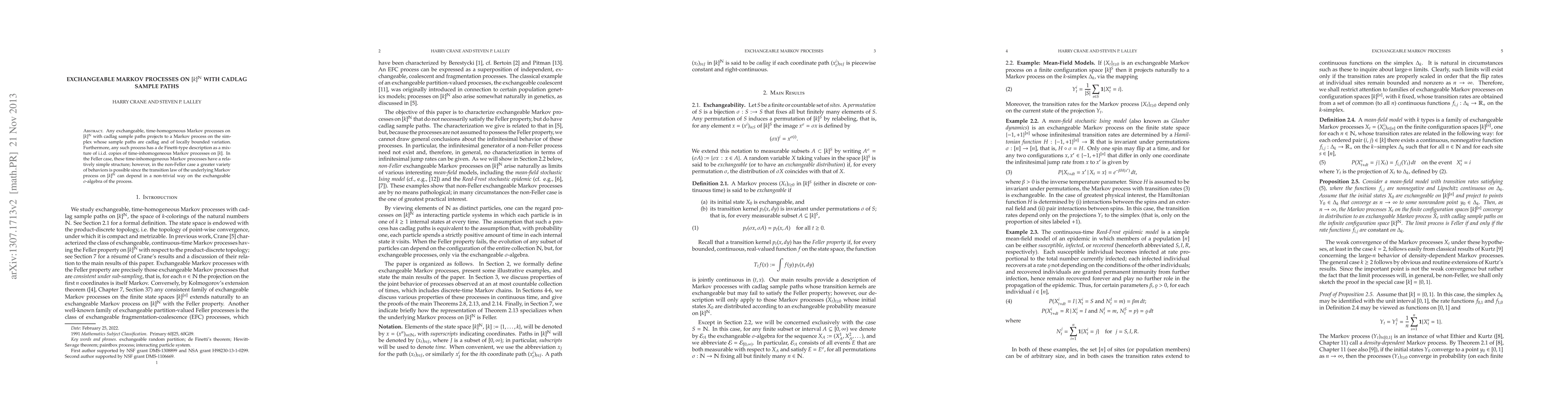 This paper explores exchangeable Markov processes on $[k]^{\mathbb{N}}$ with cadlag paths, showing they project to Markov processes on the simplex with cadlag, locally bounded variation paths. It also reveals a de Finetti-type representation as mixtures of i.i.d. time-inhomogeneous Markov processes, with varying complexity between Feller and non-Feller cases.