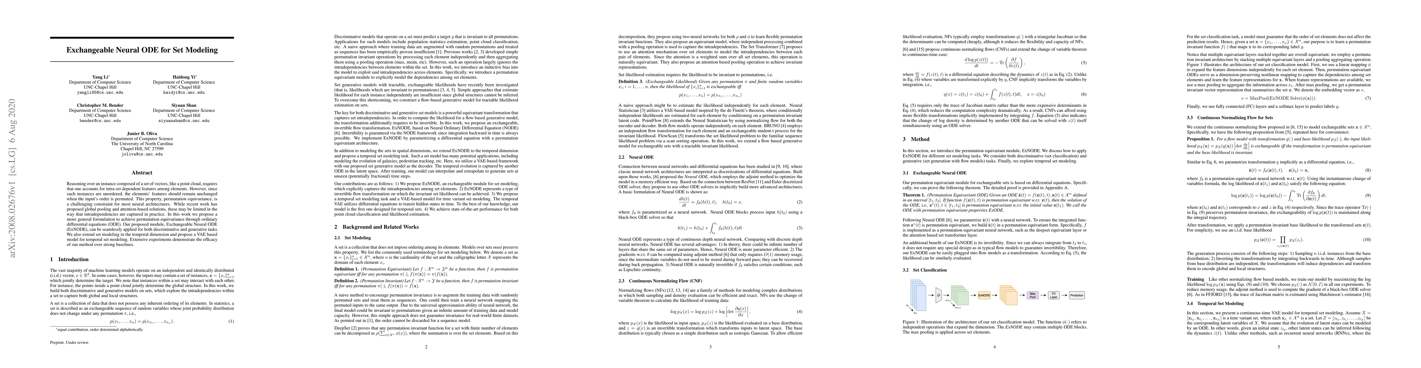 Reasoning over an instance composed of a set of vectors, like a point cloud, requires that one accounts for intra-set dependent features among elements. However, since such instances are unordered, the elements' features should remain unchanged when the input's order is permuted. This property, permutation equivariance, is a challenging constraint for most neural architectures. While recent work has proposed global pooling and attention-based solutions, these may be limited in the way that intradependencies are captured in practice. In this work we propose a more general formulation to achieve permutation equivariance through ordinary differential equations (ODE). Our proposed module, Exchangeable Neural ODE (ExNODE), can be seamlessly applied for both discriminative and generative tasks. We also extend set modeling in the temporal dimension and propose a VAE based model for temporal set modeling. Extensive experiments demonstrate the efficacy of our method over strong baselines.