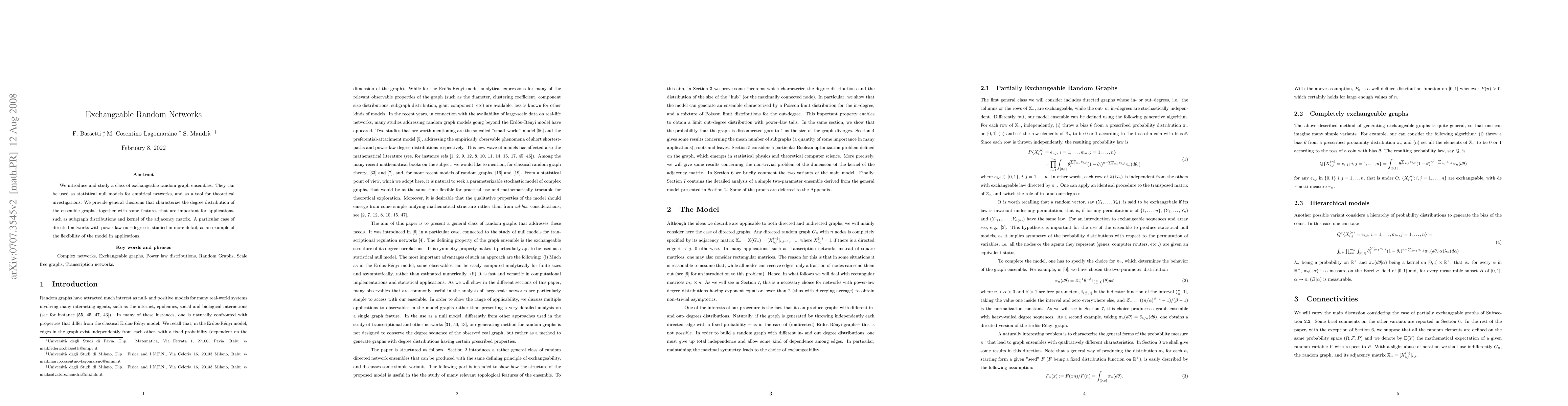 We introduce and study a class of exchangeable random graph ensembles. They can be used as statistical null models for empirical networks, and as a tool for theoretical investigations. We provide general theorems that carachterize the degree distribution of the ensemble graphs, together with some features that are important for applications, such as subgraph distributions and kernel of the adjacency matrix. These results are used to compare to other models of simple and complex networks. A particular case of directed networks with power-law out--degree is studied in more detail, as an example of the flexibility of the model in applications.