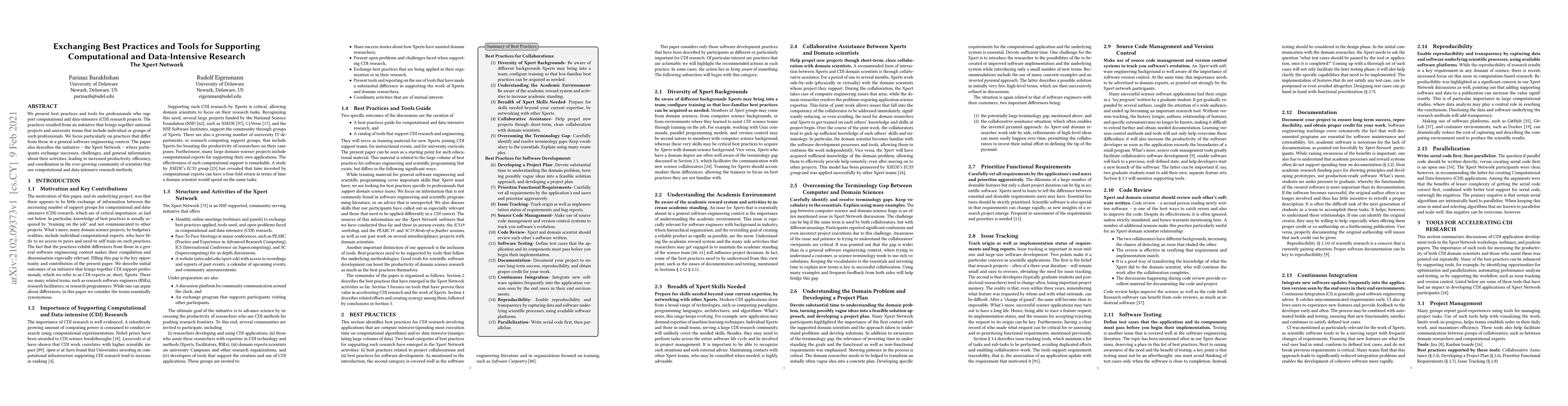 This paper outlines best practices and tools for supporting computational and data-intensive research, developed by the Xpert Network. It highlights unique practices differing from general software engineering, emphasizing increased productivity and coordination among scientists through shared experiences and information exchange.