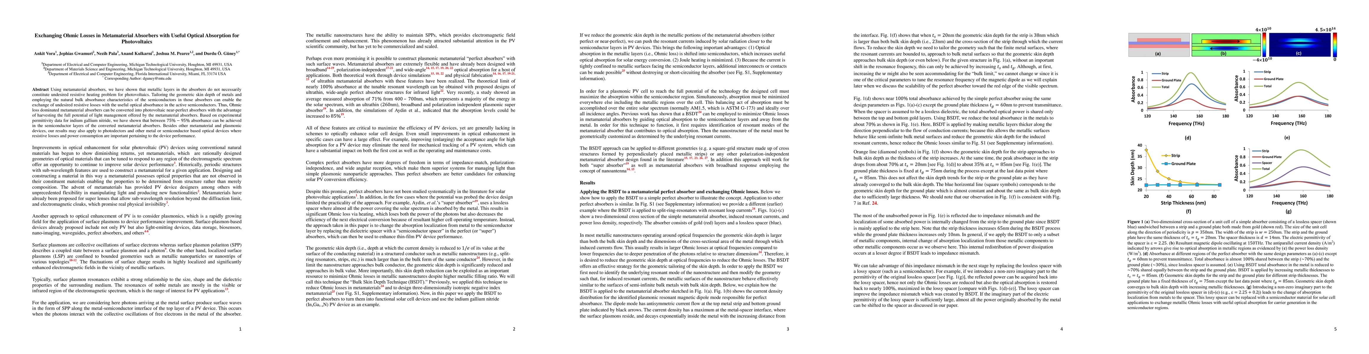Using metamaterial absorbers, we have shown that metallic layers in the absorbers do not necessarily constitute undesired resistive heating problem for photovoltaics. Tailoring the geometric skin depth of metals and employing the natural bulk absorbance characteristics of the semiconductors in those absorbers can enable the exchange of undesired resistive losses with the useful optical absorbance in the active semiconductors. Thus, Ohmic loss dominated metamaterial absorbers can be converted into photovoltaic near-perfect absorbers with the advantage of harvesting the full potential of light management offered by the metamaterial absorbers. Based on experimental permittivity data for indium gallium nitride, we have shown that between 75%-95% absorbance can be achieved in the semiconductor layers of the converted metamaterial absorbers. Besides other metamaterial and plasmonic devices, our results may also apply to photodectors and other metal or semiconductor based optical devices where resistive losses and power consumption are important pertaining to the device performance.