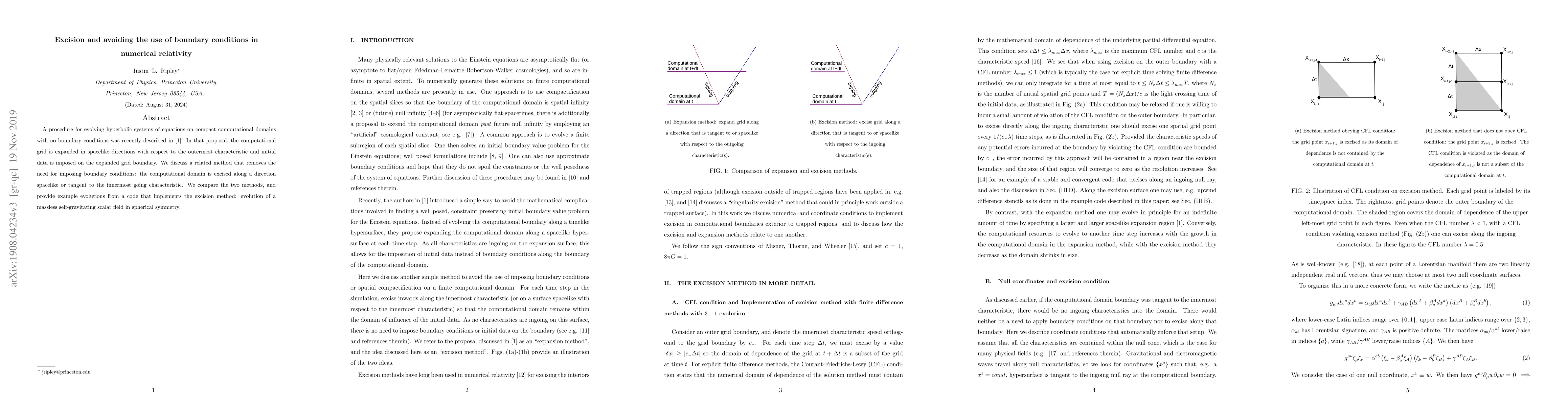 A procedure for evolving hyperbolic systems of equations on compact computational domains with no boundary conditions was recently described in [arXiv:1905.08657]. In that proposal, the computational grid is expanded in spacelike directions with respect to the outermost characteristic and initial data is imposed on the expanded grid boundary. We discuss a related method that removes the need for imposing boundary conditions: the computational domain is excised along a direction spacelike with respect to the innermost going characteristic. We compare the two methods, and provide example evolutions from a code that implements the excision method: evolution of a massless self-gravitating scalar field in spherical symmetry.