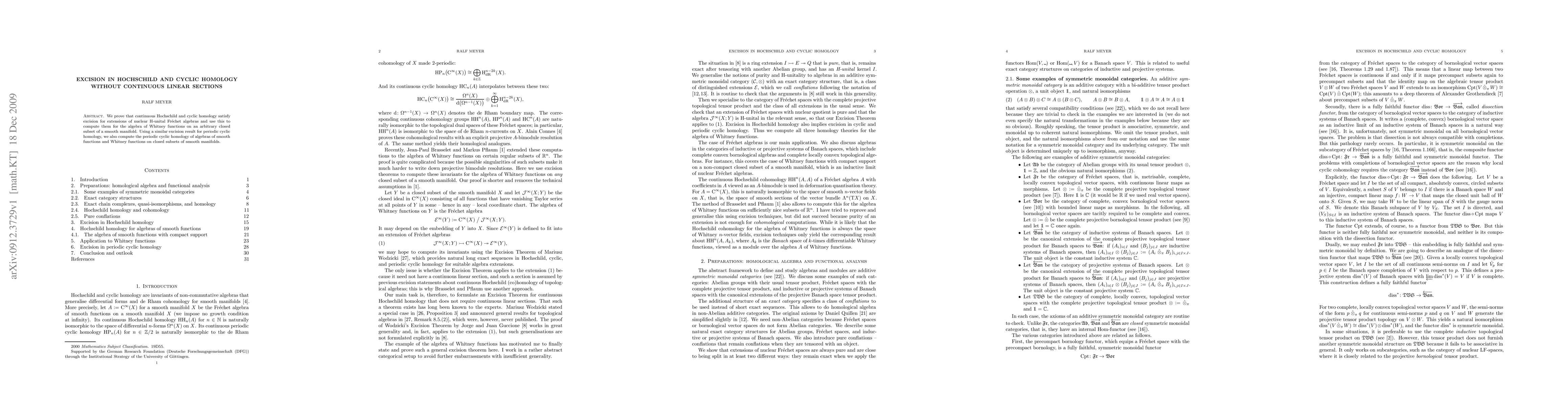 This paper proves excision properties for Hochschild and cyclic homology in nuclear H-unital Fréchet algebras, enabling computations for Whitney functions on closed subsets of smooth manifolds. It also applies excision for periodic cyclic homology to determine periodic cyclic homology for smooth functions on such closed subsets.