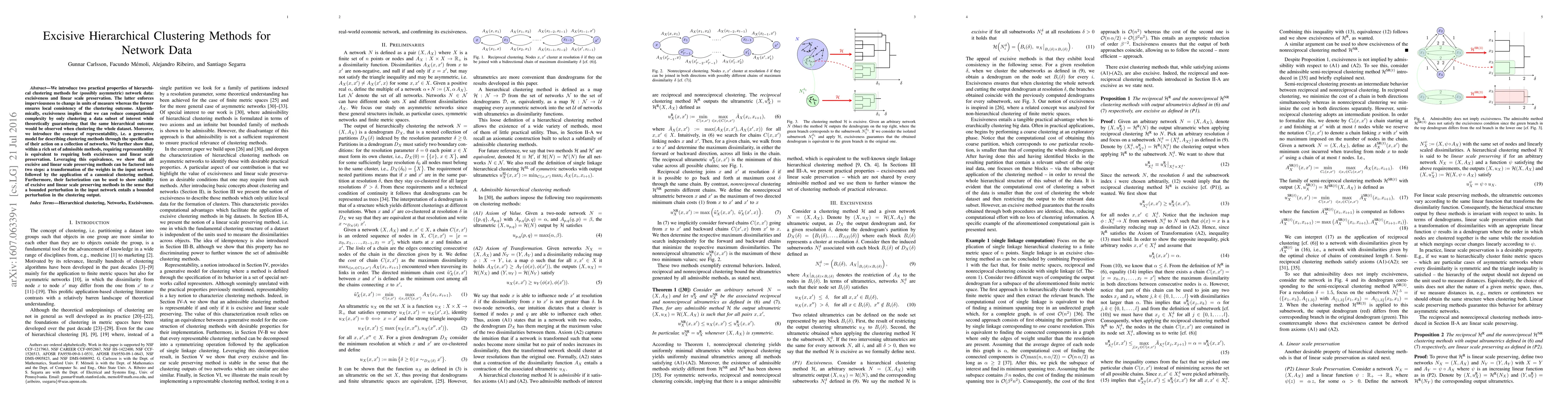 This paper introduces excisive hierarchical clustering methods for network data that maintain local consistency and are impervious to changes in measurement units. It demonstrates that excisiveness allows computational complexity reduction by focusing only on subsets while preserving the overall clustering outcome.