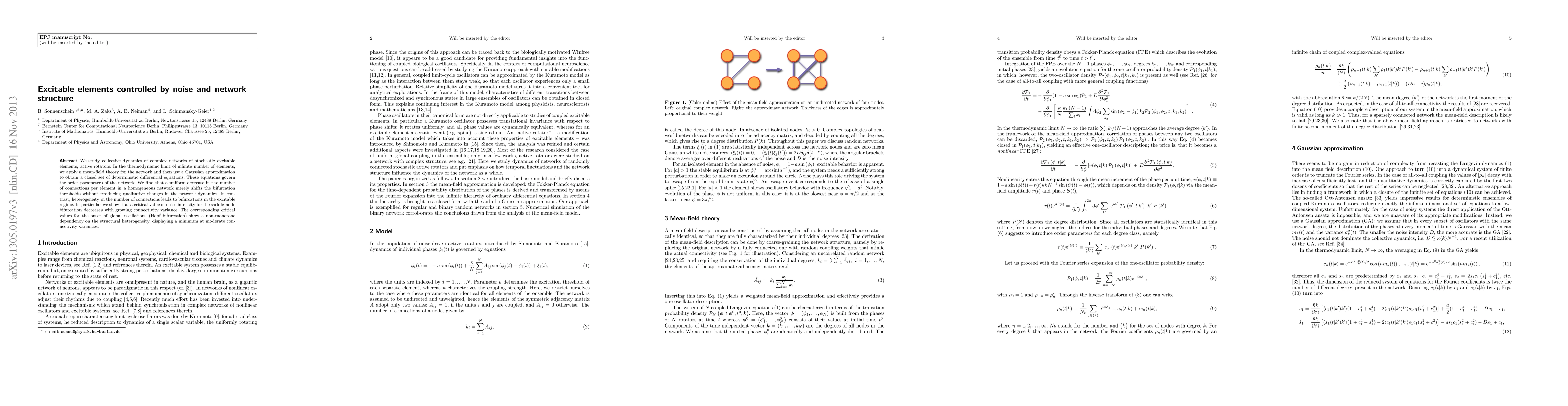 We study collective dynamics of complex networks of stochastic excitable elements, active rotators. In the thermodynamic limit of infinite number of elements, we apply a mean-field theory for the network and then use a Gaussian approximation to obtain a closed set of deterministic differential equations. These equations govern the order parameters of the network. We find that a uniform decrease in the number of connections per element in a homogeneous network merely shifts the bifurcation thresholds without producing qualitative changes in the network dynamics. In contrast, heterogeneity in the number of connections leads to bifurcations in the excitable regime. In particular we show that a critical value of noise intensity for the saddle-node bifurcation decreases with growing connectivity variance. The corresponding critical values for the onset of global oscillations (Hopf bifurcation) show a non-monotone dependency on the structural heterogeneity, displaying a minimum at moderate connectivity variances.