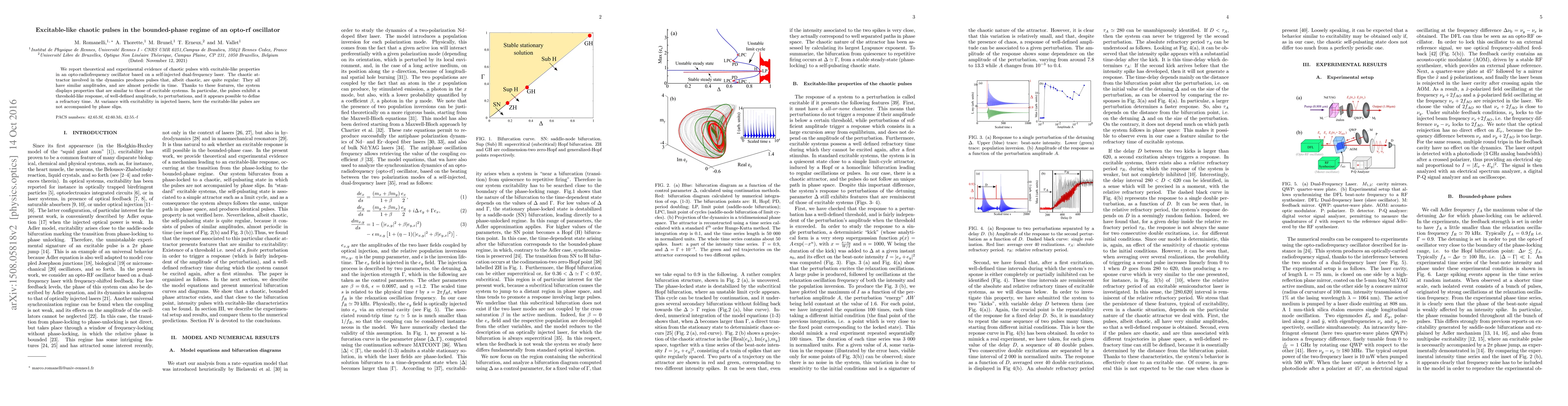 This paper presents both theoretical and experimental findings on chaotic pulses in an opto-radiofrequency oscillator, which exhibit excitable-like properties despite their irregularity. The system shows a threshold response to perturbations and a refractory time, akin to excitable systems, without phase slips.