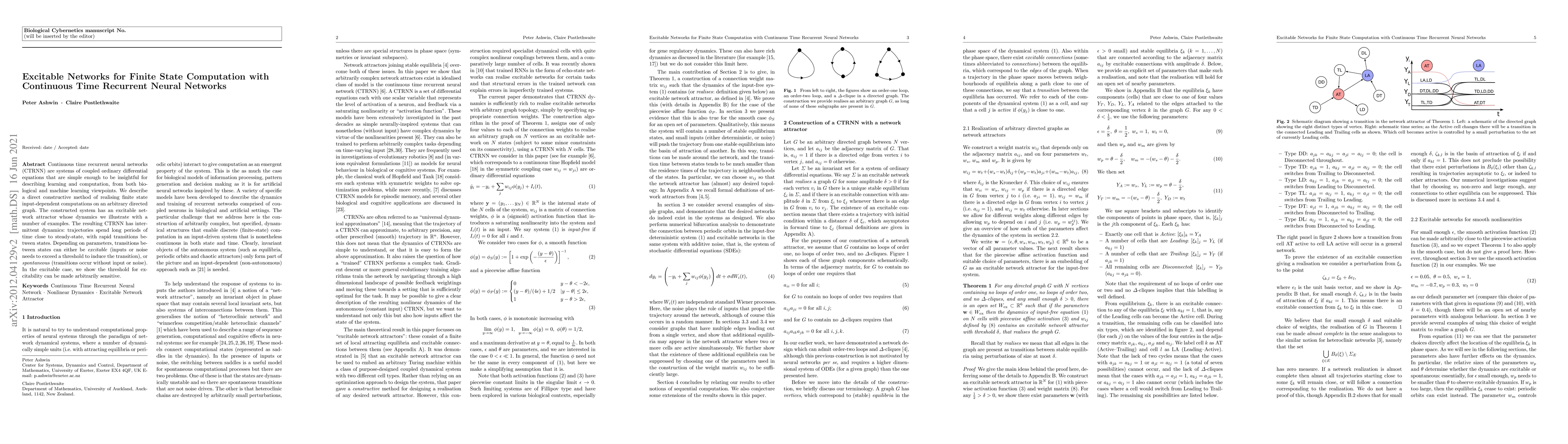 Continuous time recurrent neural networks (CTRNN) are systems of coupled ordinary differential equations that are simple enough to be insightful for describing learning and computation, from both biological and machine learning viewpoints. We describe a direct constructive method of realising finite state input-dependent computations on an arbitrary directed graph. The constructed system has an excitable network attractor whose dynamics we illustrate with a number of examples. The resulting CTRNN has intermittent dynamics: trajectories spend long periods of time close to steady-state, with rapid transitions between states. Depending on parameters, transitions between states can either be excitable (inputs or noise needs to exceed a threshold to induce the transition), or spontaneous (transitions occur without input or noise). In the excitable case, we show the threshold for excitability can be made arbitrarily sensitive.