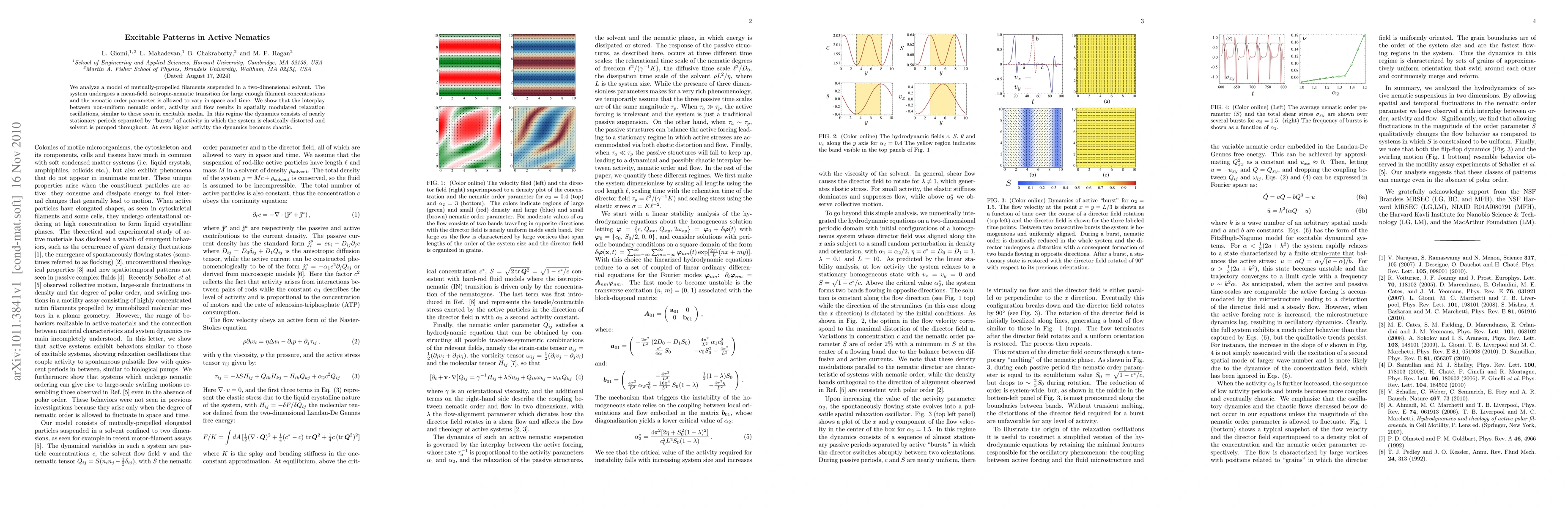 We analyze a model of mutually-propelled filaments suspended in a two-dimensional solvent. The system undergoes a mean-field isotropic-nematic transition for large enough filament concentrations and the nematic order parameter is allowed to vary in space and time. We show that the interplay between non-uniform nematic order, activity and flow results in spatially modulated relaxation oscillations, similar to those seen in excitable media. In this regime the dynamics consists of nearly stationary periods separated by "bursts" of activity in which the system is elastically distorted and solvent is pumped throughout. At even higher activity the dynamics becomes chaotic.