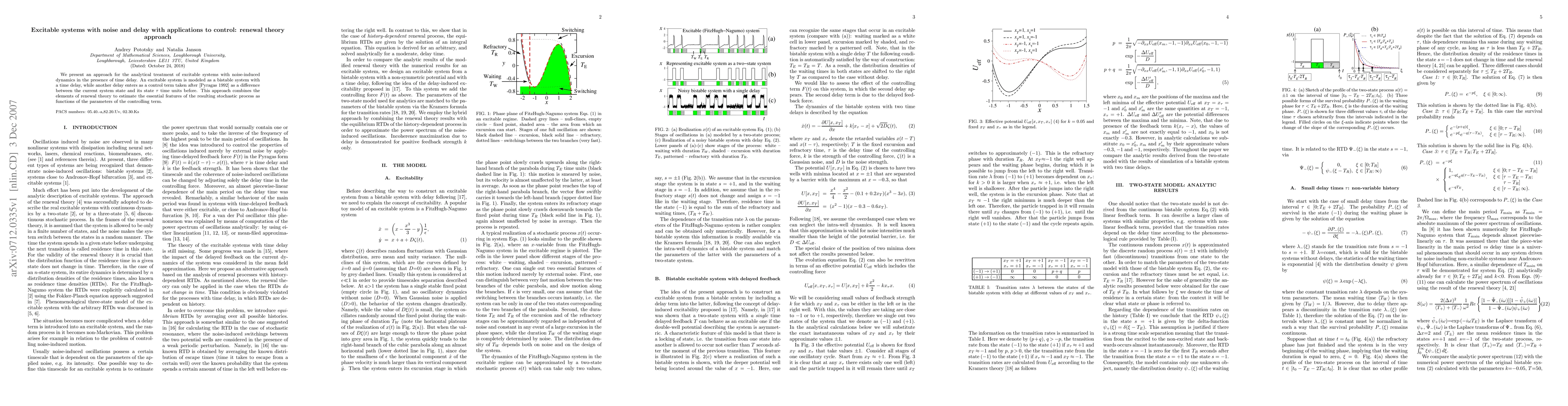 This paper develops an analytical method for excitable systems with noise and time delay, modeling them as bistable systems and incorporating a control term. The approach uses renewal theory to estimate the stochastic process characteristics influenced by the control parameters.