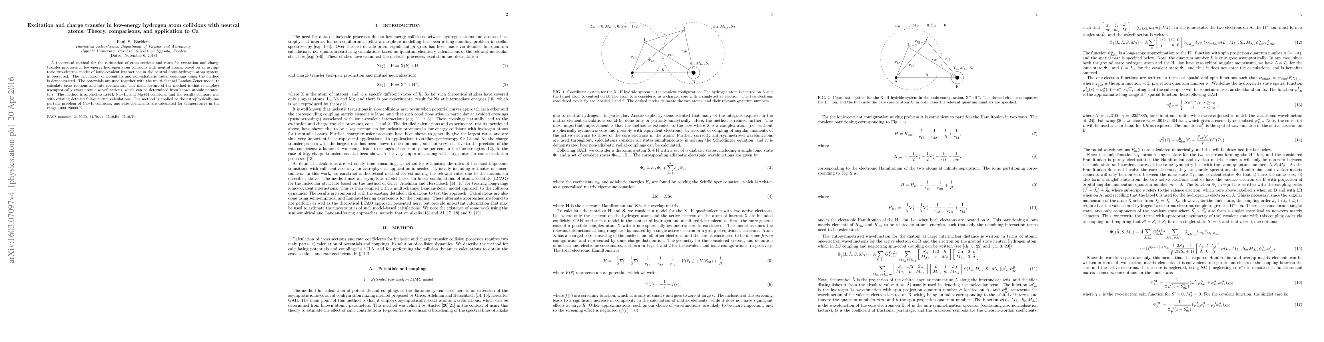 This paper presents a theoretical method for estimating cross sections and rates for excitation and charge transfer in low-energy hydrogen atom collisions with neutral atoms, employing asymptotically exact atomic wavefunctions. The method is applied to Li+H, Na+H, and Mg+H collisions, and it calculates rate coefficients for Ca+H collisions relevant to astrophysical conditions.