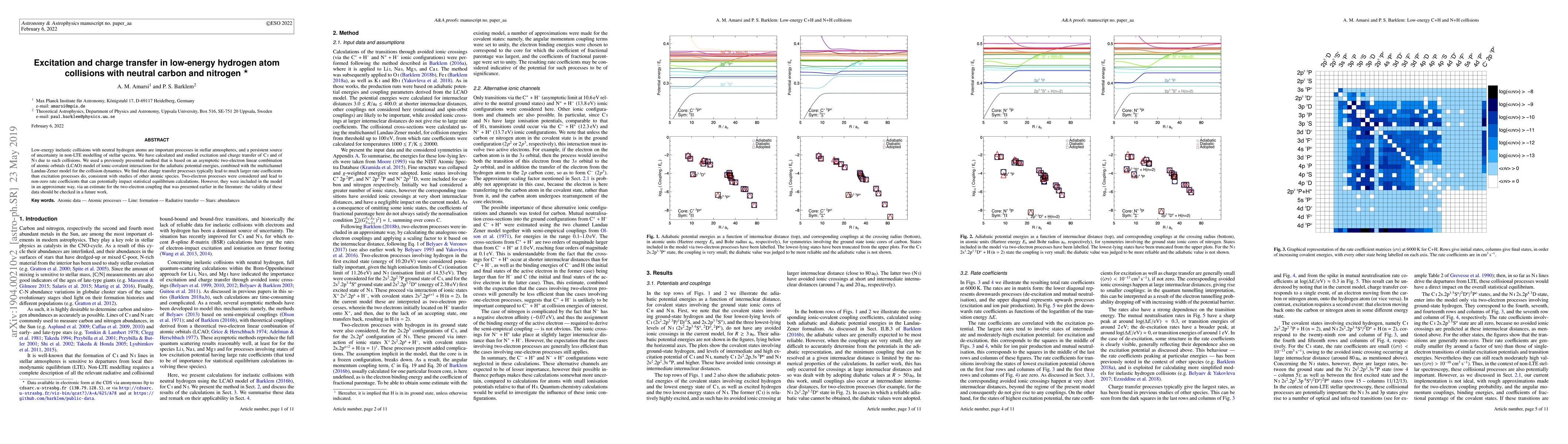 This paper investigates low-energy hydrogen atom collisions with neutral carbon and nitrogen, focusing on excitation and charge transfer processes. The study finds that charge transfer processes yield significantly larger rate coefficients than excitation processes, with two-electron processes also contributing, though approximately.