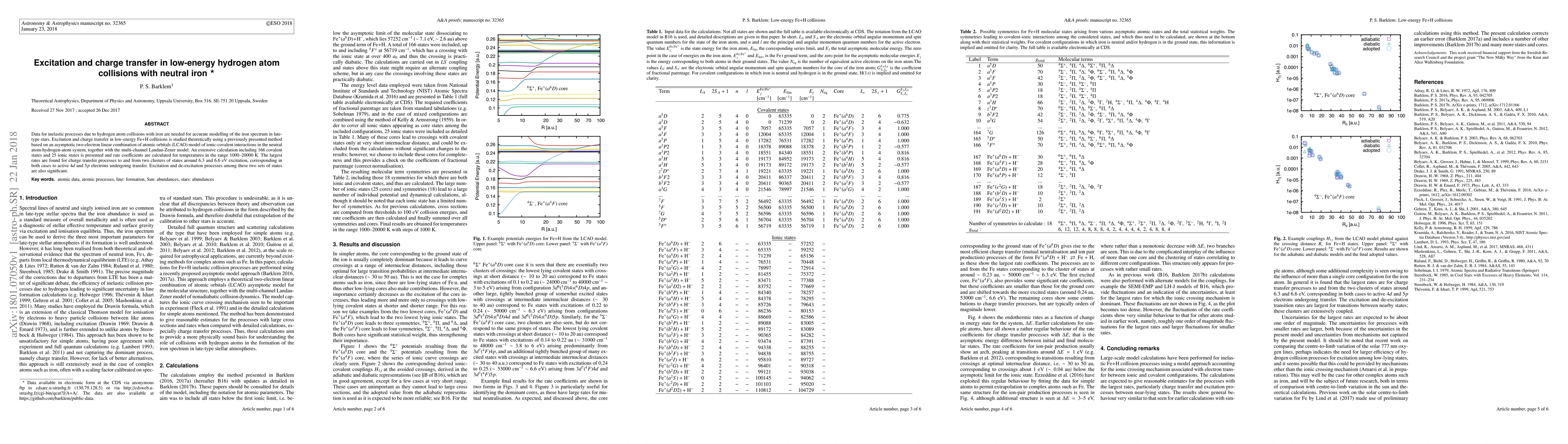 This paper theoretically investigates excitation and charge transfer in low-energy hydrogen atom collisions with neutral iron, using a two-electron LCAO model and multi-channel Landau-Zener model. The study provides rate coefficients for processes relevant to modeling the iron spectrum in late-type stars, highlighting significant charge transfer and excitation processes around 6.3 and 6.6 eV.