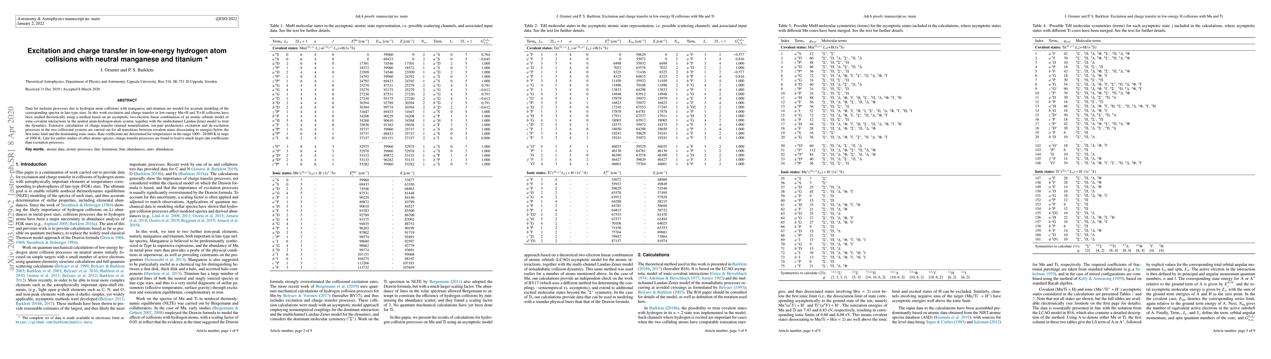 This paper investigates excitation and charge transfer in low-energy collisions between hydrogen atoms and neutral manganese and titanium atoms, using theoretical models to determine rate coefficients for various processes. Charge transfer is found to dominate over excitation processes, with significant implications for spectral modeling in late-type stars.