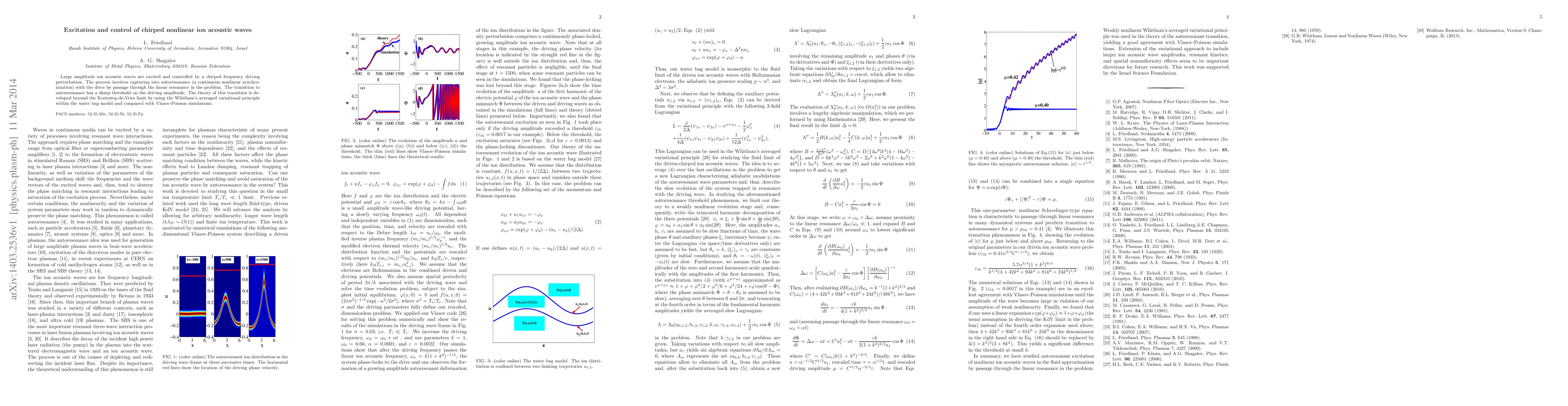 This paper explores the excitation and control of large amplitude ion acoustic waves using a chirped frequency driving perturbation, detailing the transition into autoresonance and its sharp threshold. The study extends the theory beyond the Korteweg-de-Vries limit using Whitham's averaged variational principle and validates the findings with Vlasov-Poisson simulations.