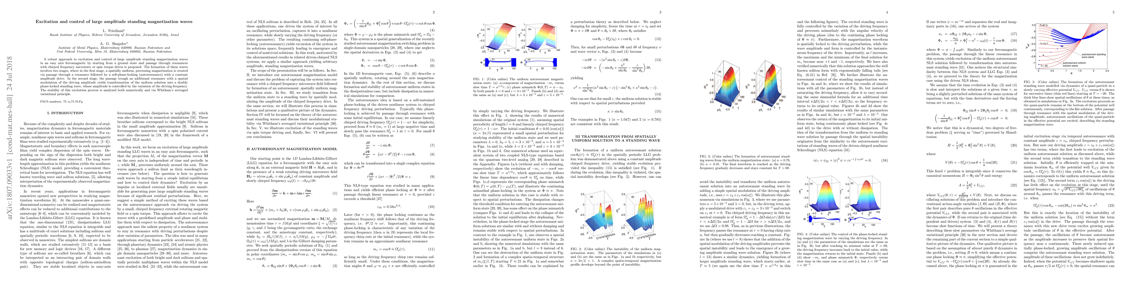 A robust approach to excitation and control of large amplitude standing magnetization waves in an easy axis ferromagnetic by starting from a ground state and passage through resonances with chirped frequency microwave or spin torque drives is proposed. The formation of these waves involves two stages, where in the first stage, a spatially uniform, precessing magnetization is created via passage through a resonance followed by a self-phase-locking (autoresonance) with a constant amplitude drive. In the second stage, the passage trough an additional resonance with a spatial modulation of the driving amplitude yields transformation of the uniform solution into a doubly phase-locked standing wave, whose amplitude is controlled by the variation of the driving frequency. The stability of this excitation process is analyzed both numerically and via Whitham's averaged variational principle.