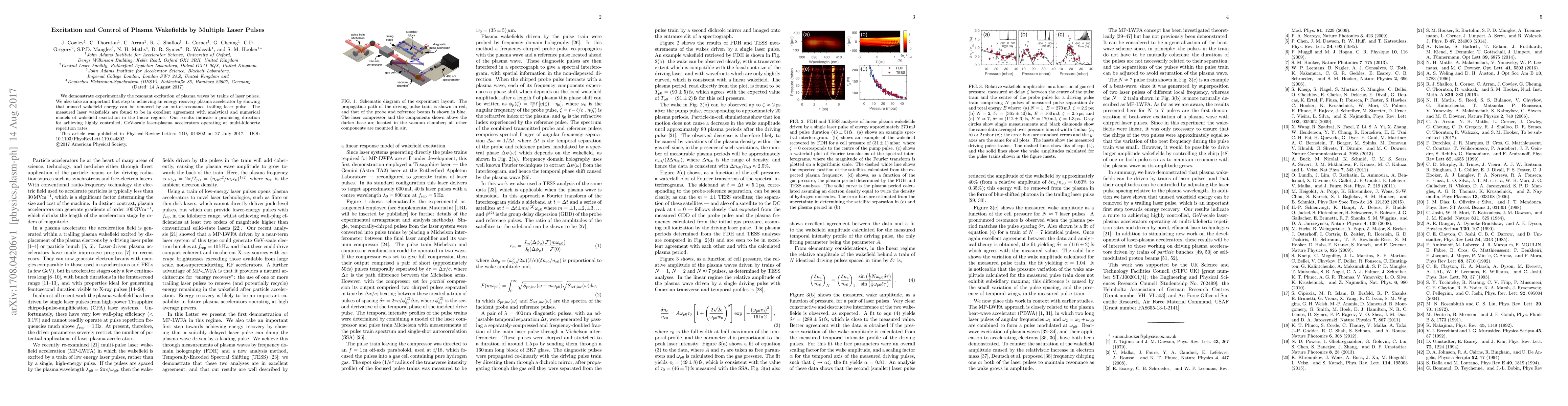 We demonstrate experimentally the resonant excitation of plasma waves by trains of laser pulses. We also take an important first step to achieving an energy recovery plasma accelerator by showing that unused wakefield energy can be removed by an out-of-resonance trailing laser pulse. The measured laser wakefields are found to be in excellent agreement with analytical and numerical models of wakefield excitation in the linear regime. Our results indicate a promising direction for achieving highly controlled, GeV-scale laser-plasma accelerators operating at multi-kilohertz repetition rates. This article was published in Physical Review Letters 119, 044802 on 27 July 2017. DOI: 10.1103/PhysRevLett.119.044802 Copyright 2017 American Physical Society.
