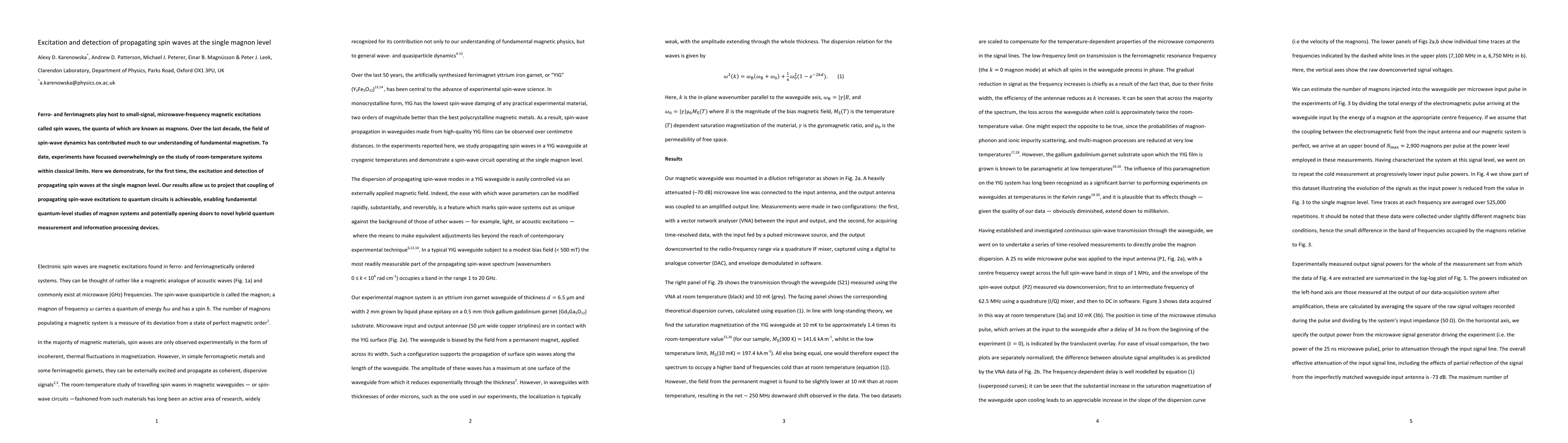 This paper reports the first successful excitation and detection of propagating spin waves at the single magnon level, advancing the field of spin-wave dynamics. This breakthrough enables coupling of magnon excitations to quantum circuits, paving the way for quantum-level studies and potential applications in hybrid quantum measurement and information processing.
