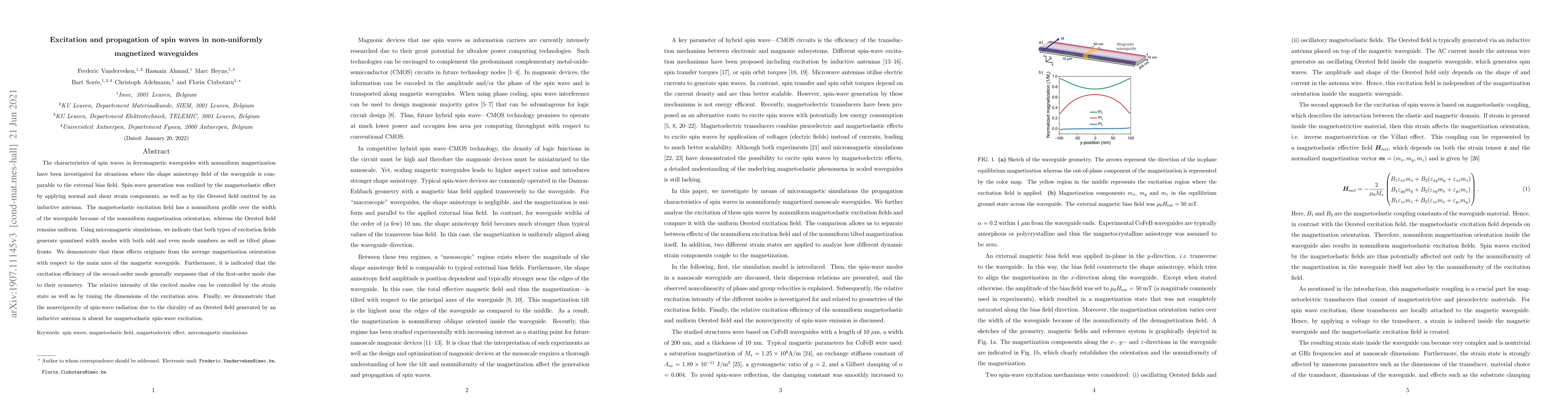 The characteristics of spin waves in ferromagnetic waveguides with nonuniform magnetization have been investigated for situations where the shape anisotropy field of the waveguide is comparable to the external bias field. Spin-wave generation was realized by the magnetoelastic effect by applying normal and shear strain components, as well as by the Oersted field emitted by an inductive antenna. The magnetoelastic excitation field has a nonuniform profile over the width of the waveguide because of the nonuniform magnetization orientation, whereas the Oersted field remains uniform. Using micromagnetic simulations, we indicate that both types of excitation fields generate quantised width modes with both odd and even mode numbers as well as tilted phase fronts. We demonstrate that these effects originate from the average magnetization orientation with respect to the main axes of the magnetic waveguide. Furthermore, it is indicated that the excitation efficiency of the second-order mode generally surpasses that of the first-order mode due to their symmetry. The relative intensity of the excited modes can be controlled by the strain state as well as by tuning the dimensions of the excitation area. Finally, we demonstrate that the nonreciprocity of spin-wave radiation due to the chirality of an Oersted field generated by an inductive antenna is absent for magnetoelastic spin-wave excitation.