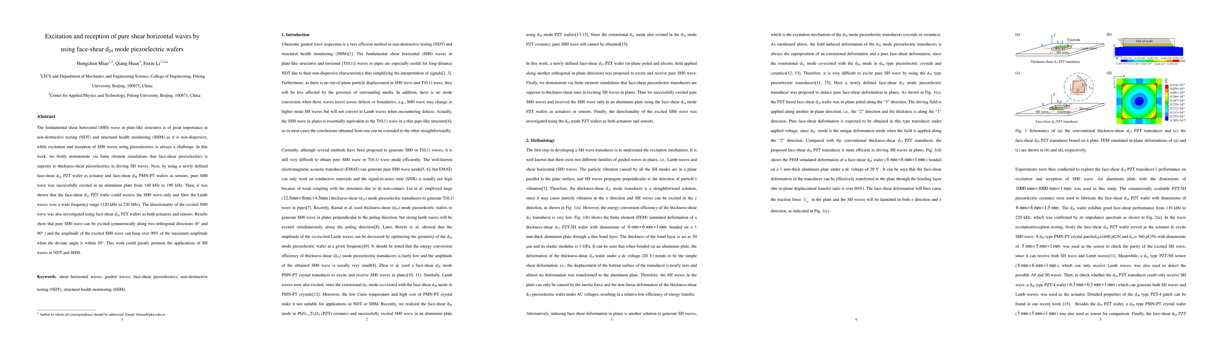 This paper demonstrates the effective excitation and reception of pure shear horizontal (SH0) waves using face-shear d24 mode piezoelectric wafers, showing superior performance over thickness-shear piezoelectrics. Pure SH0 waves were successfully generated in an aluminum plate and effectively filtered from Lamb waves, enhancing applications in non-destructive testing and structural health monitoring.