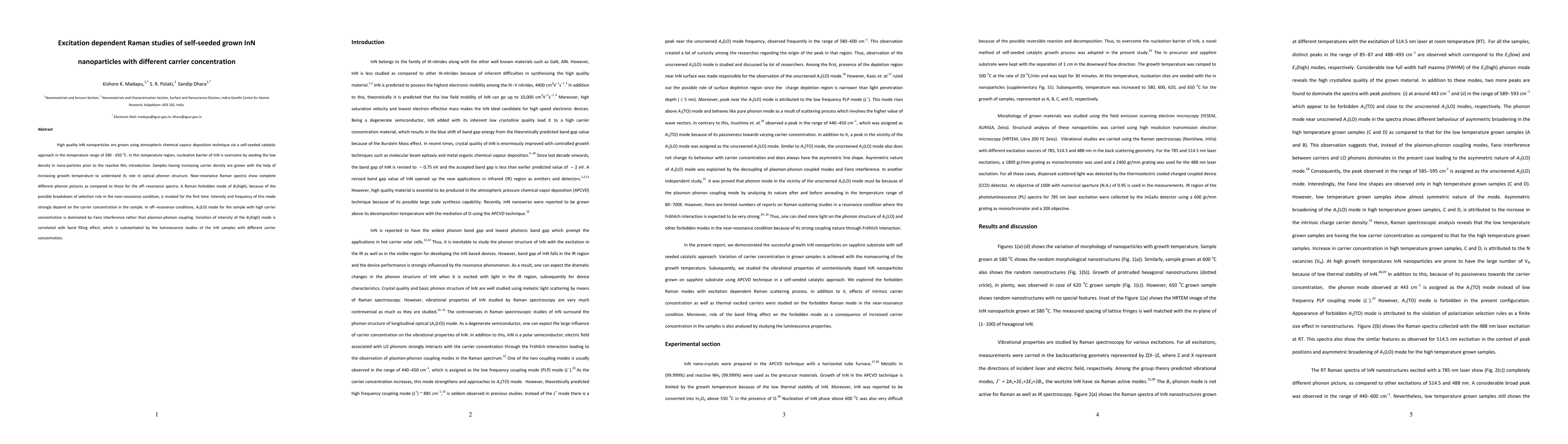 High quality InN nanoparticles are grown using atmospheric chemical vapour deposition technique via a self-seeded catalytic approach in the temperature range of 580 to 650 oC. In this temperature region, nucleation barrier of InN is overcome by seeding the low density In nano-particles prior to the introduction of reactive ammonia. Samples having increasing carrier density are grown with the help of increasing growth temperature to understand its role in optical phonon structure. Near resonance Raman spectra show complete different phonon pictures as compared to those for the off-resonance spectra. A Raman forbidden mode of B1(high), because of the possible breakdown of selection rule in the near-resonance condition, is invoked for the first time. Intensity and frequency of this mode strongly depend on the carrier concentration in the sample. In off-resonance conditions, A1(LO) mode for the sample with high carrier concentration is dominated by Fano interference rather than plasmon-phonon coupling. Variation of intensity of the B1(high) mode is correlated with band filling effect, which is substantiated by the luminescence studies of the InN samples with different carrier concentration.
